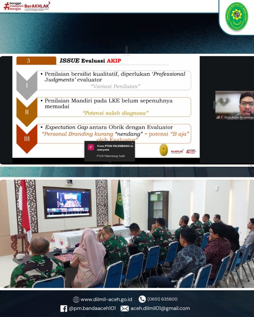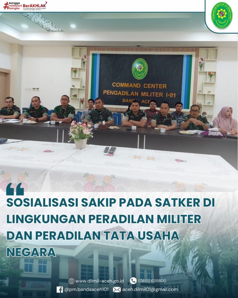 - Kepala Pengadilan Militer I-01 Banda Aceh mengucapkan terimakasih atas kehadiran seluruh Anggota dan Pegawai dalam mengikuti rapat pada hari ini dengan agenda Rapat Monitoring dan Evaluasi bulan Desember Tahun 2025. Pada kesempatan pertama Kadilmil melakukan monitoring yang berkaitan dengan capaian kinerja yang telah tercapai dan yang masih belum tercapai, sehingga capaian kinerja yang telah tercapai agar terus dipertahankan dan ditingkatkan, yang belum tercapai agar pada tahun depan dapat tercapai sesuai target yang telah direncanakan.