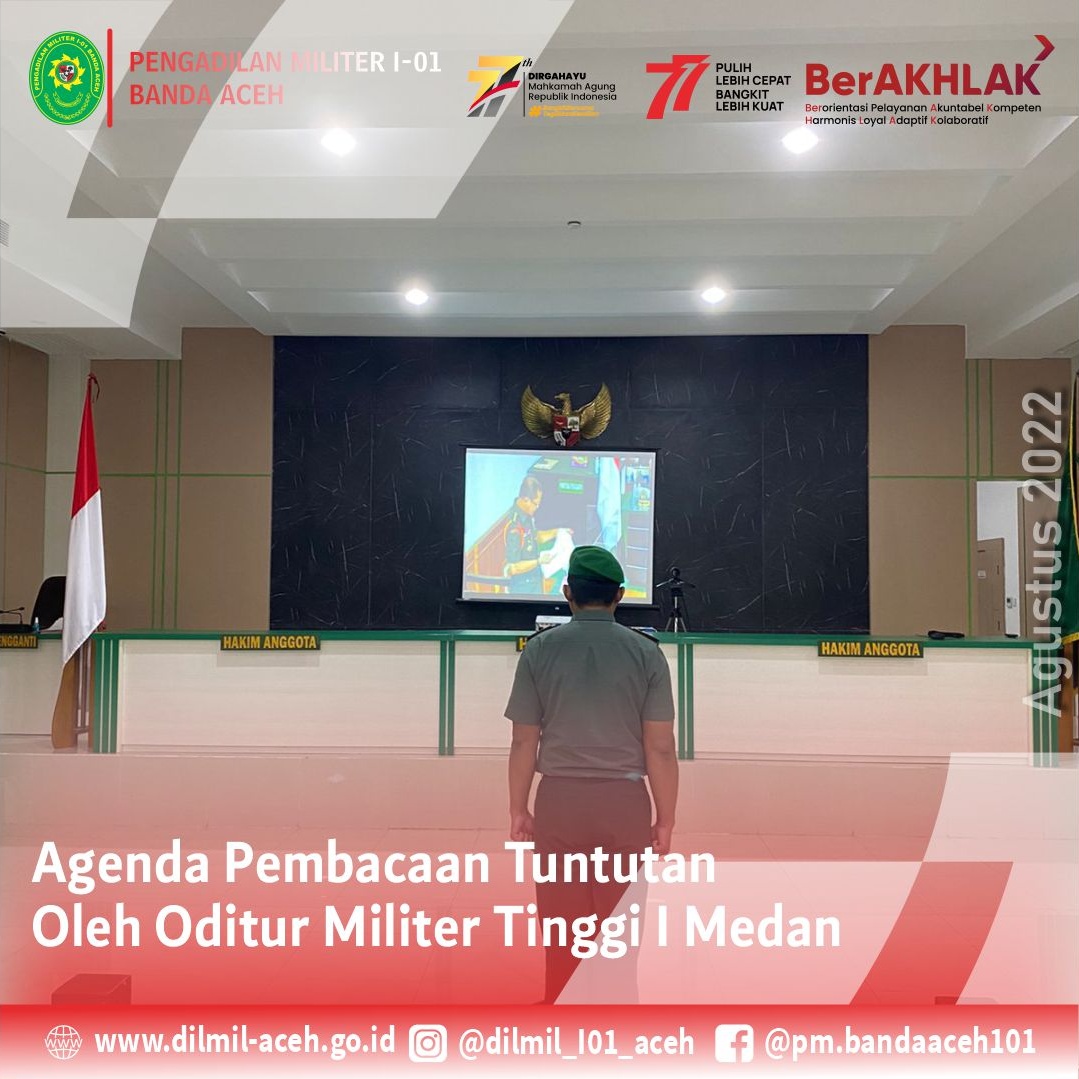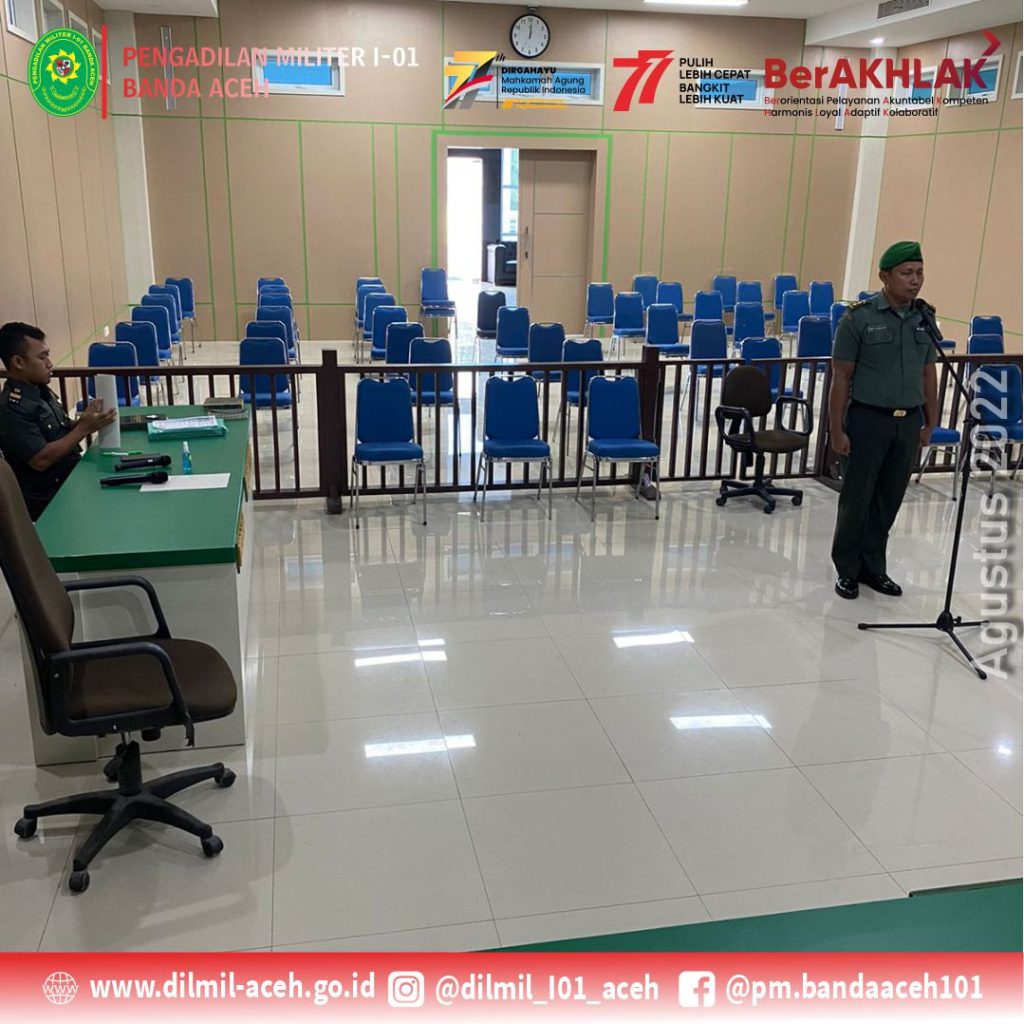 Banda Aceh – 22 Agustus 2022, Pengadilan Militer I-01 Banda Aceh kembali melaksanakan sidang lanjutan secara teleconference/virtual yang diselenggarakan oleh Pengadilan Militer Tinggi I Medan dengan agenda pembacaan tuntutan oleh Oditur Militer Tinggi I Medan.