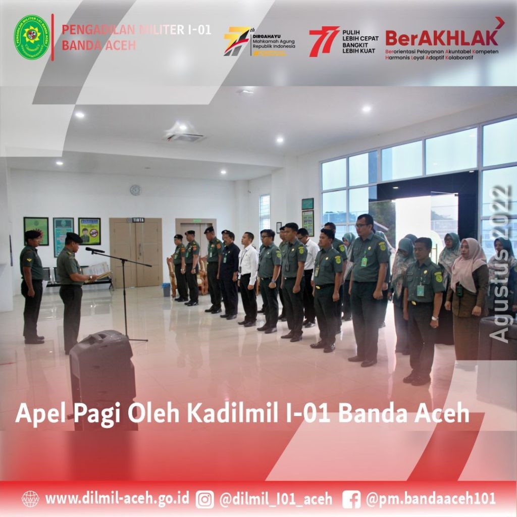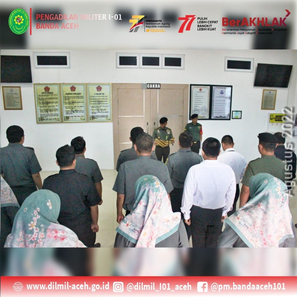 Banda Aceh – 24 Agustus 2022. Pelaksanaan Apel pagi dipimpin langsung oleh Kepala Pengadilan Militer I-01 Banda Aceh, Kolonel Chk Masykur, S.T., S.H., M.H.