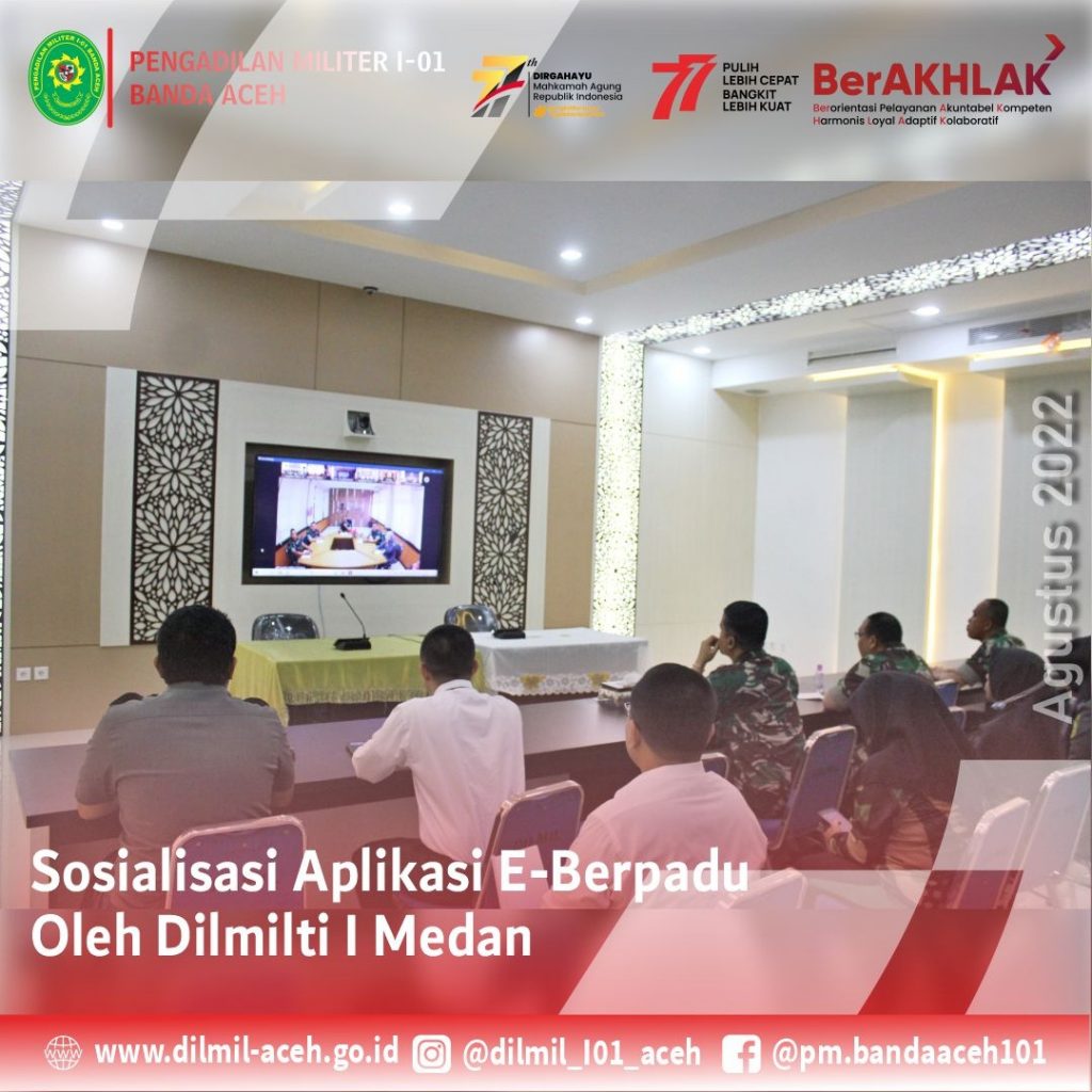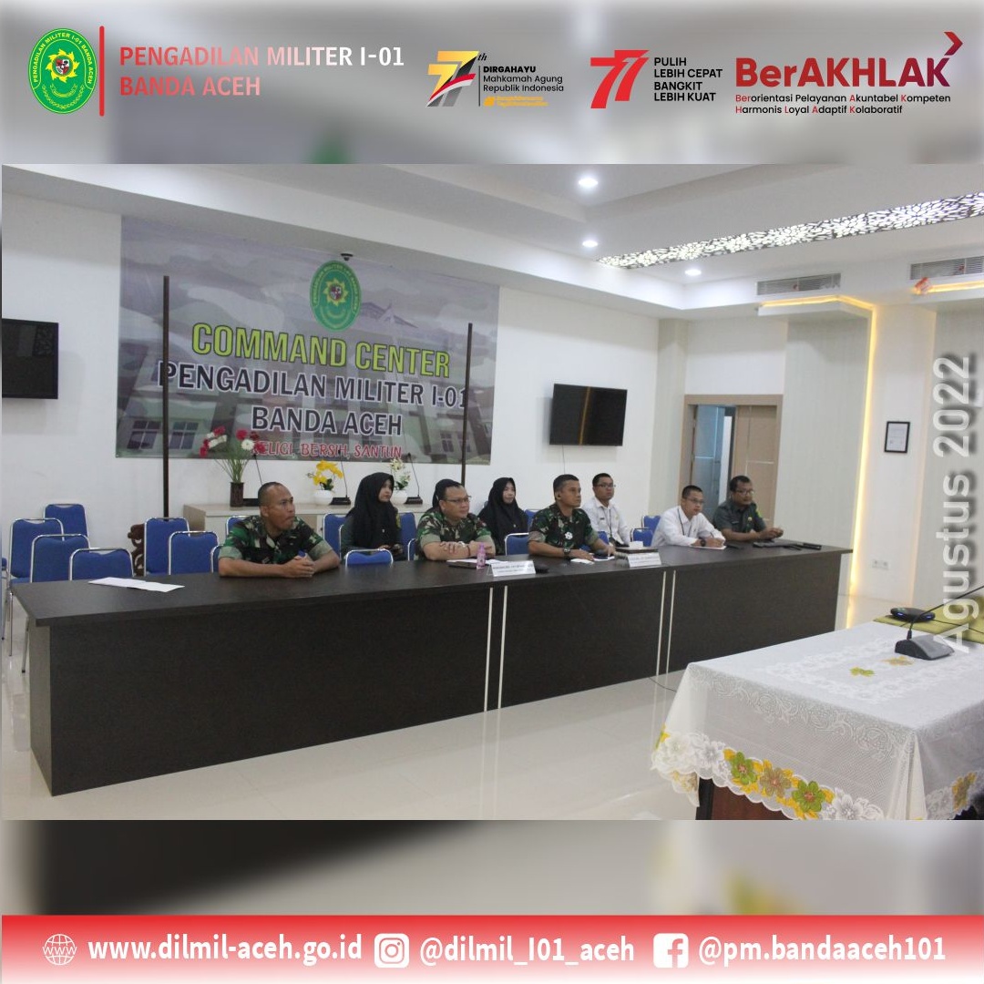 Banda Aceh – 23 Agustus 2022. Kepala Pengadilan Militer I-01 Banda Aceh Kolonel Chk Masykur, S.T., S.H., M.H., didampingi Wakil Kepala, Hakim Militer, Panitera Muda dan Staf Kepaniteraan mengikuti sosialisasi Aplikasi E-Berpadu (Elektronik Berkas Pidana Terpadu) yang diselenggarakan oleh Pengadilan Militer Tinggi I Medan secara daring.