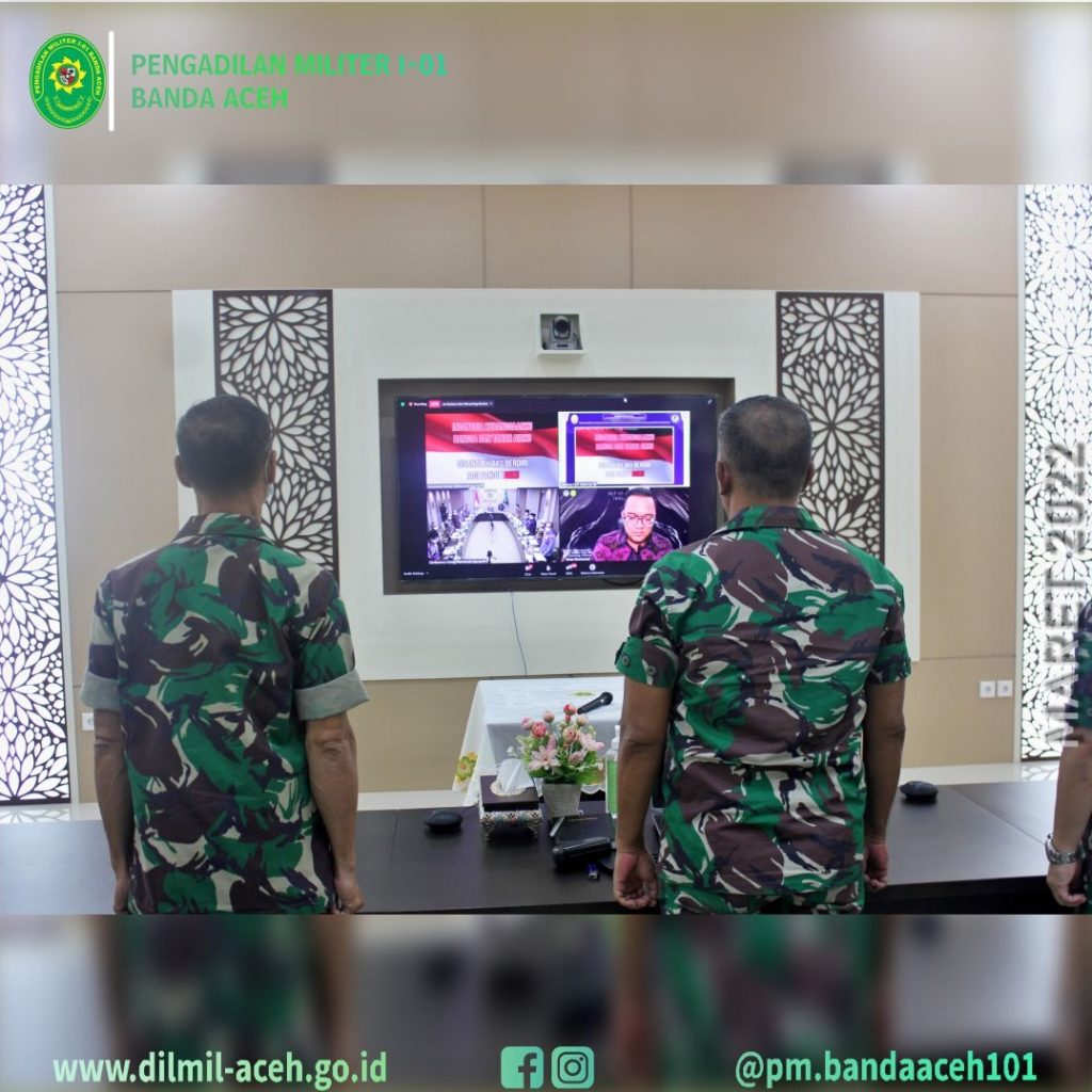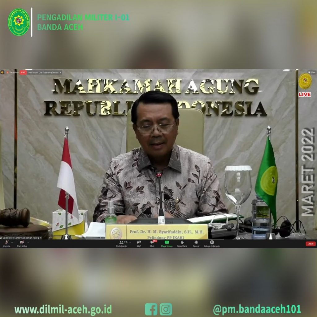 Banda Aceh – 17 Maret 2022. Kadilmil I-01 Banda Aceh Kolonel Laut (KH) Riza Fadilah, S.H. beserta Pokkimmil Pengadilan Militer I-01 Banda Aceh Mengikuti Acara Webinar Internasional Dalam Rangka Hari Ulang Tahun ke-69 Ikatan Hakim Indonesia Tahun 2022 secara virtual di ruang auditorium Pengadilan Militer I-01 Banda Aceh.