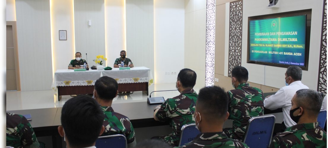 Banda Aceh – 6 Desember 2021, Pengadilan Militer I-01 Banda Aceh menerima kunjungan Binwas Dilmiltama yaitu Hakim Militer Utama Brigjen TNI, Dr. Slamet Sarwo Edy S.H., M.Hum. didampingi Kabag Umum dan Keuangan Dilmiltama, Letkol Chk Endang Sumiarto, S.H.,M.H.