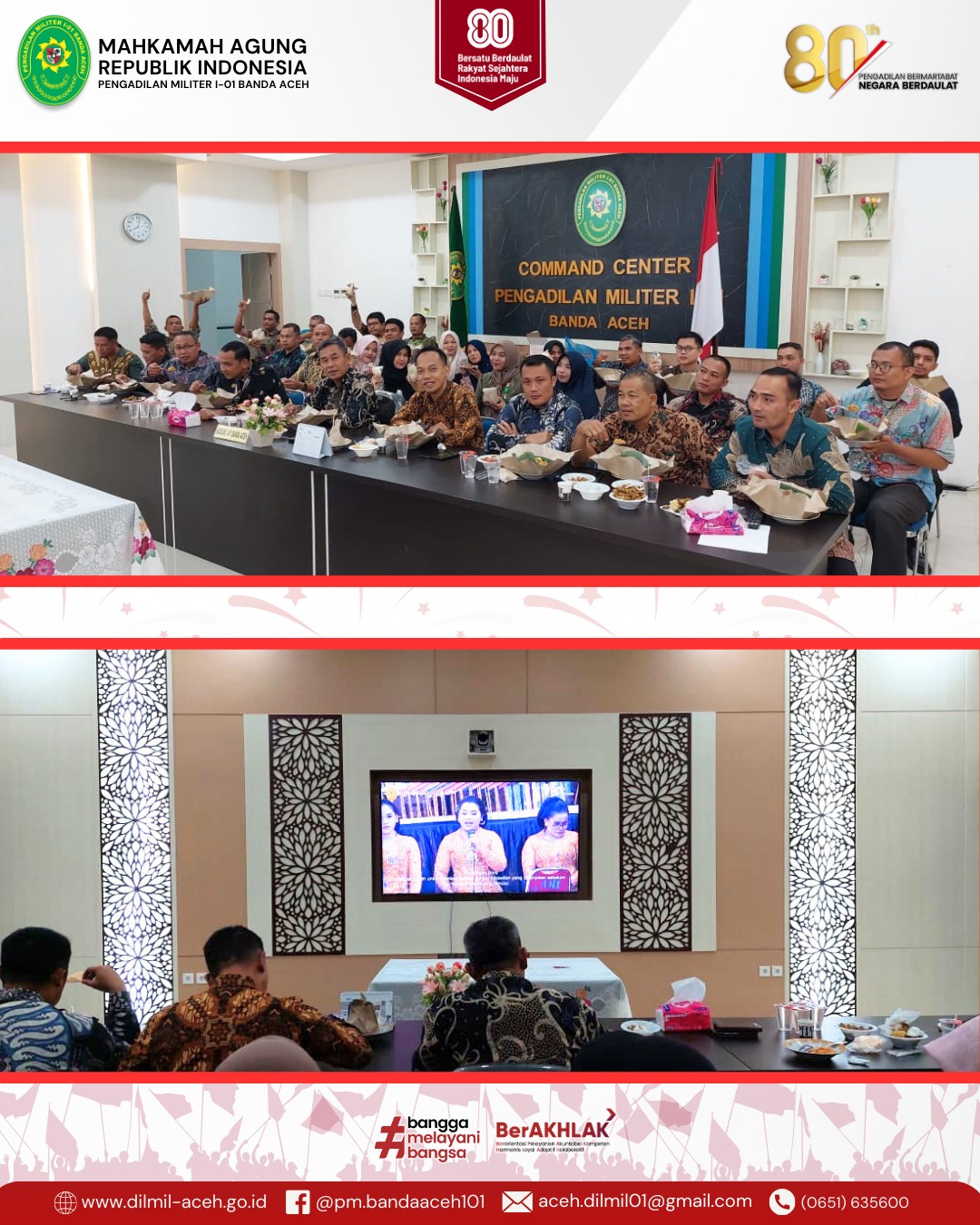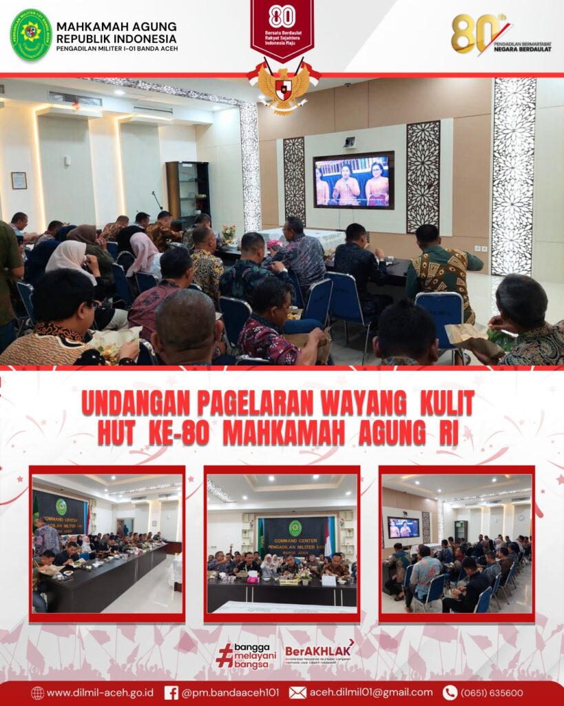 Banda Aceh – Jumat, 22 Agustus 2025. Kepala Pengadilan Militer I-01 Banda Aceh, Kolonel Chk Khamdan, S.Ag., S.H., M.H. beserta seluruh personil menghadiri secara live streaming acara Pagelaran Wayang Kulit dalam rangka HUT ke-80 Mahkamah Agung RI. Sebuah pagelaran budaya yang sarat makna, menjadi pengingat bahwa peradilan tidak hanya menjunjung tinggi keadilan, tetapi juga melestarikan nilai-nilai luhur bangsa.