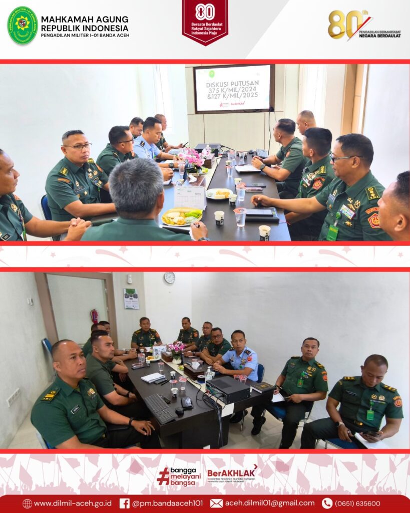 Banda Aceh – 6 Agustus 2025. Kepala Pengadilan Militer I-01 Banda Aceh bersama para Hakim, Panitera, dan Panitera Pengganti melaksanakan diskusi mendalam mengenai putusan Nomor 375 K/Mil/2024, terdakwa didakwa dengan dakwaan kumulatif yaitu Pertama Pasal 29 Juncto Pasal 4 Ayat (1) huruf d dan e Undang-Undang Nomor 44 Tahun 2008 tentang Pornografi dan Kedua Pasal 281 ke-1 KUHP, jika terdakwa di persidangan memberikan keterangan yang berbeda dengan keterangan yang ada di Berita Acara Pemeriksaan (BAP) hendaknya Majelis Hakim memerintahkan Oditur Militer untuk memanggil saksi verbal lisan agar dapat di cross check keterangan terdakwa di persidangan.