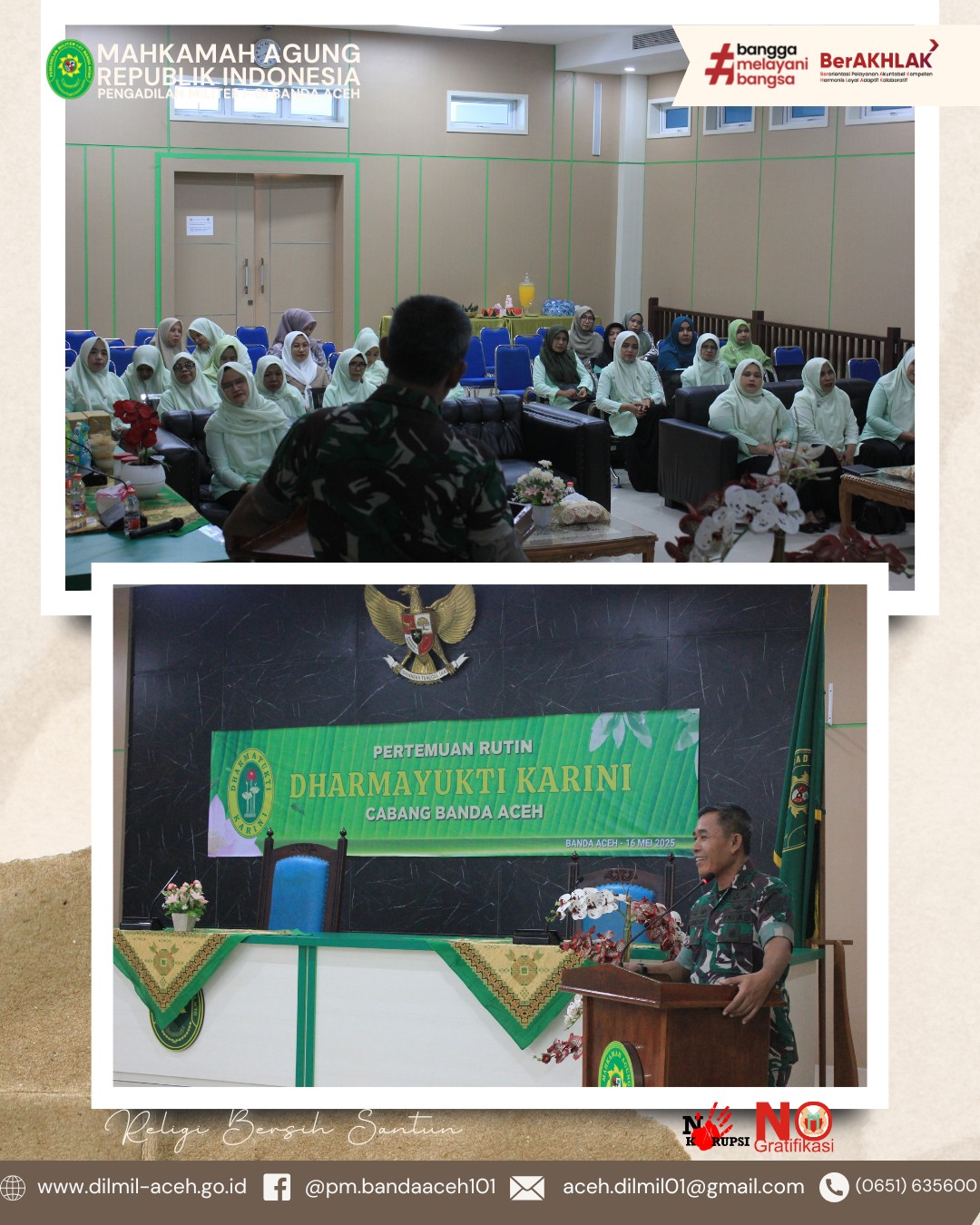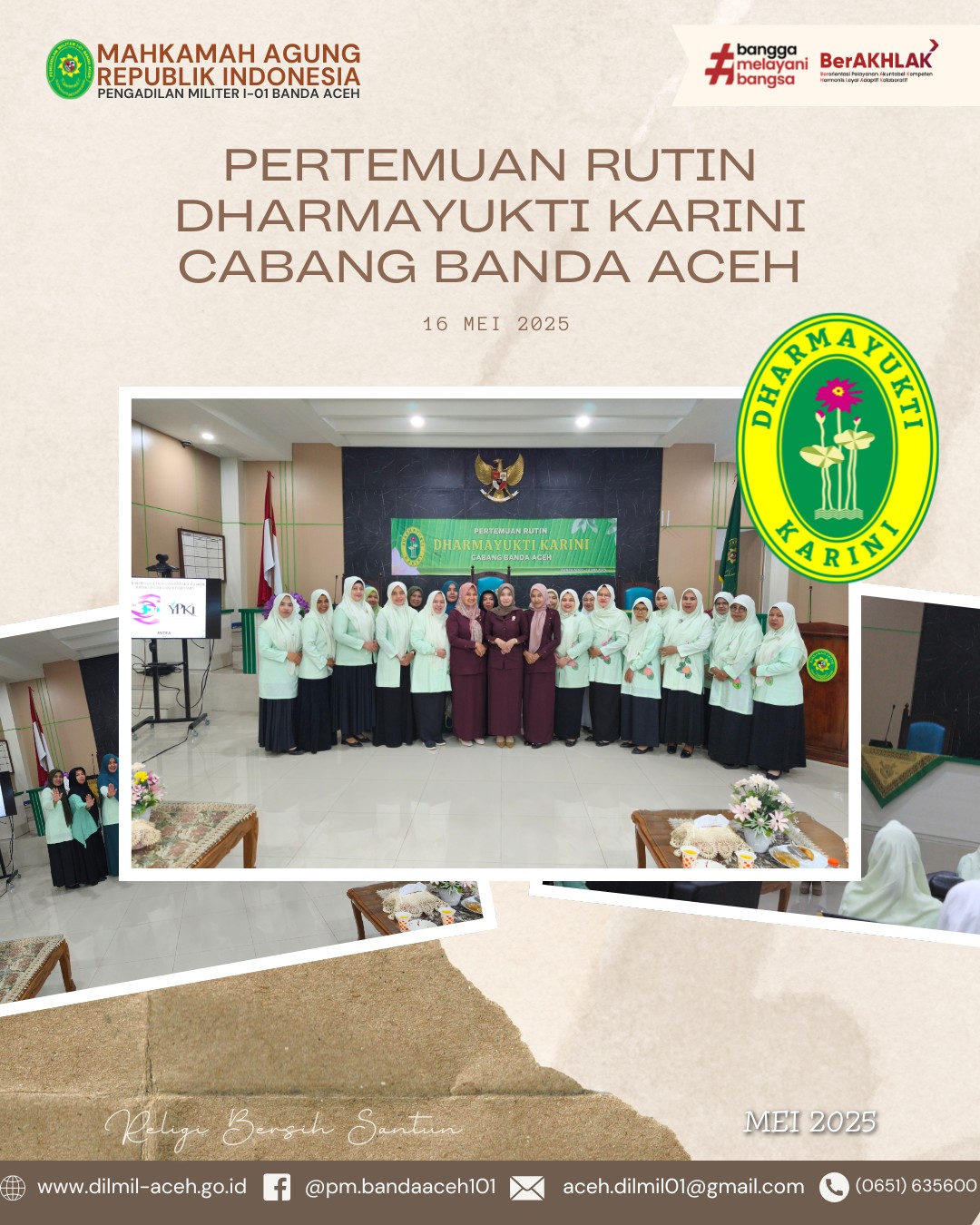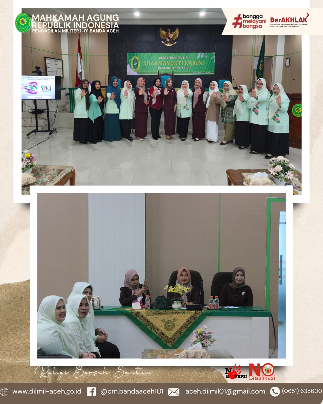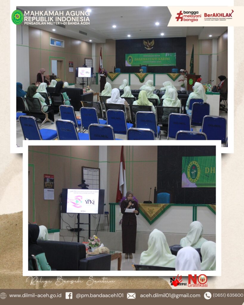 Banda Aceh – 16 Mei 2025. Bertempat di Pengadilan Militer I-01 Banda Aceh telah berlangsung pertemuan rutin Dharmayukti yang di ikuti oleh seluruh anggota Dharmayukti Karini cabang Banda Aceh. Pada pertemuan rutin kali ini terdapat sosialisasi oleh Yayasan Pemerhati Kanker Indonesia (YPKI) dan Yayasan Melawan Kanker Bersama Indonesia (YMKBI). Dalam sosialisasi tersebut dijelaskan mengenai berbagai macam kanker beserta penyebabnya, cara mencegah terkena kanker, cara mendeteksi kanker secara mandiri, cara-cara pengobatan kanker, serta himbauan agar selalu berperilaku hidup bersih dan sehat.