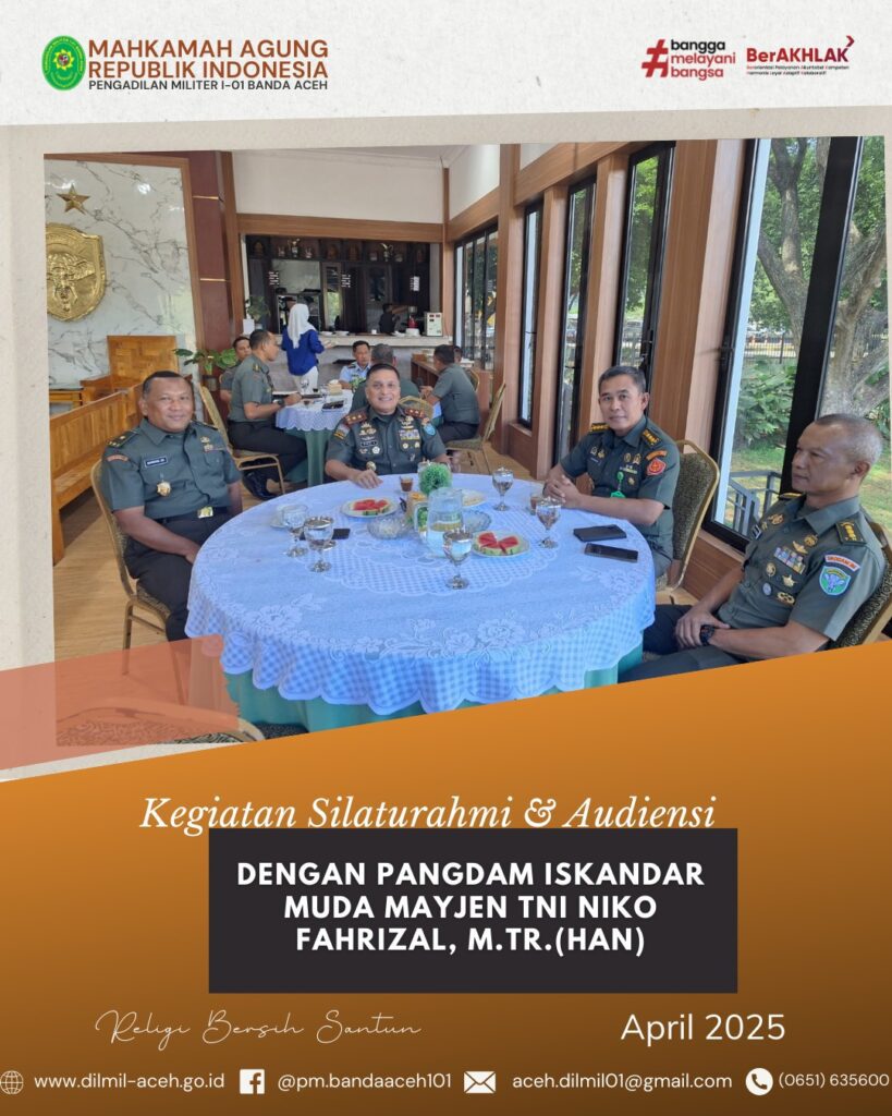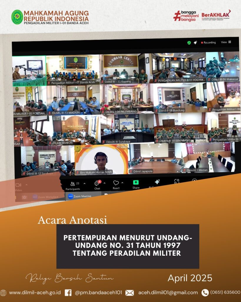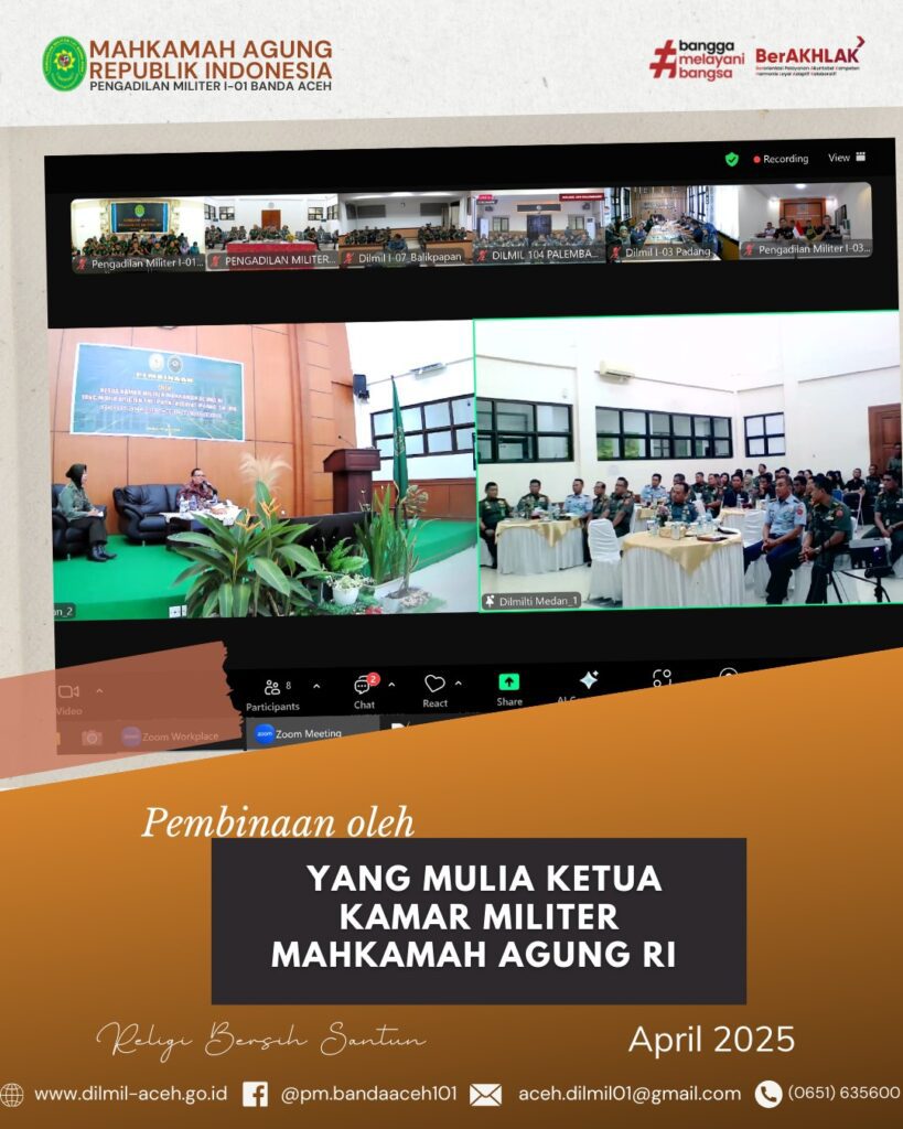 Banda Aceh – 2 Mei 2025. Telah dilaksanakan Rapat Monitoring Evaluasi Bulan Mei 2025 yang dipimpin oleh Kadilmil I-01 Banda Aceh Kolonel Chk Khamdan, S.Ag., S.H., M.H. Pada kegiatan monev bulan ini kadilmil menyampaikan