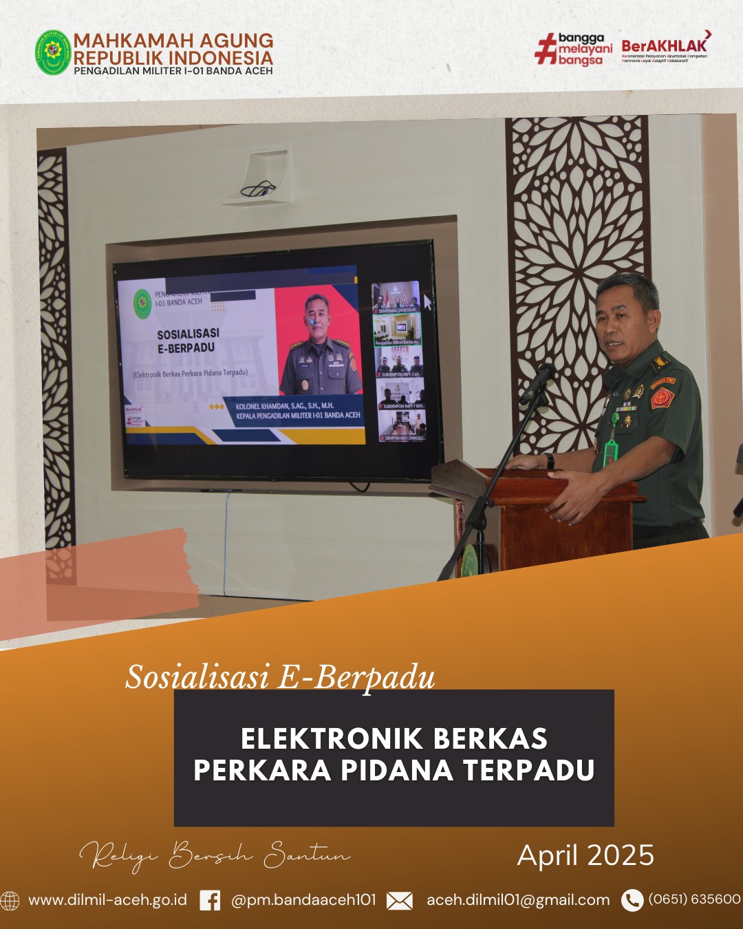 1. Terimakasih kepada seluruh anggota dikarenakan kegiatan sosialisasi E-Berpadu bersama Aparat Penegak Hukum (APH) baik secara luring maupun daring yang dilaksanakan pada hari Rabu tanggal 30 April 2025 telah berjalan dengan baik kemudian bahwa e-Berpadu harus segera diimplementasikan dan diterapkan dengan bekerja sama dengan institusi Aparat Penegak Hukum di wilayah hukum Pengadilan Militer I-01 Banda Aceh