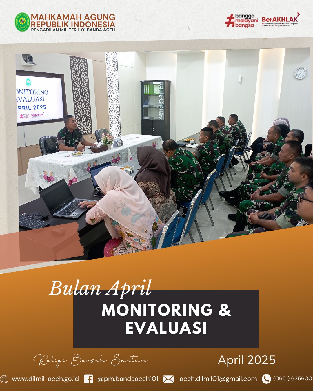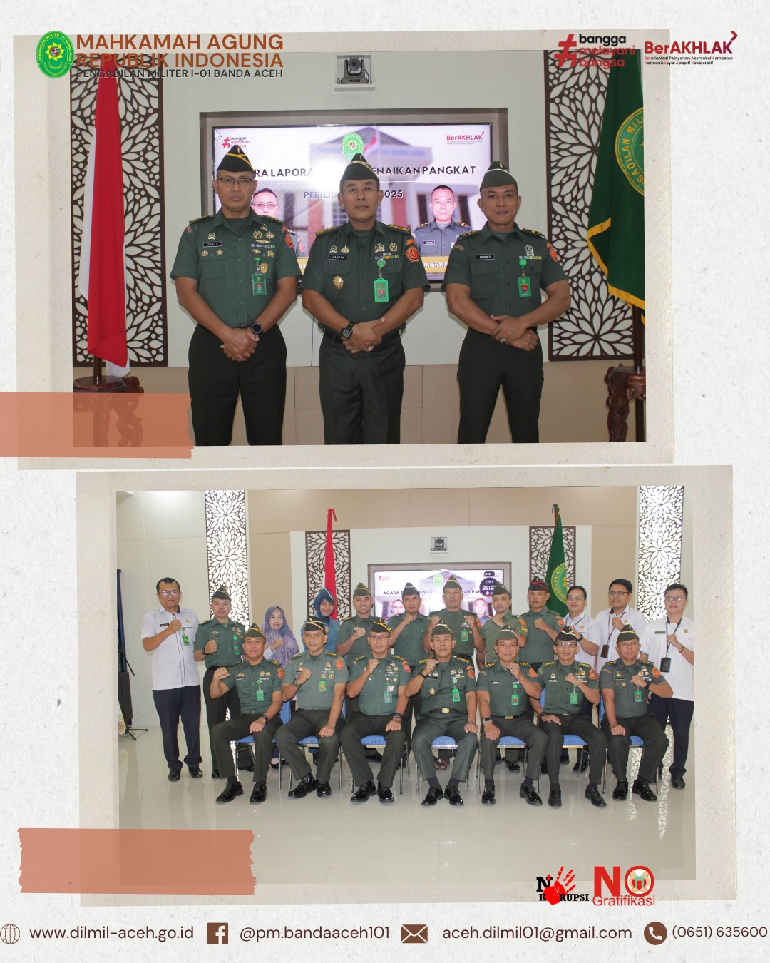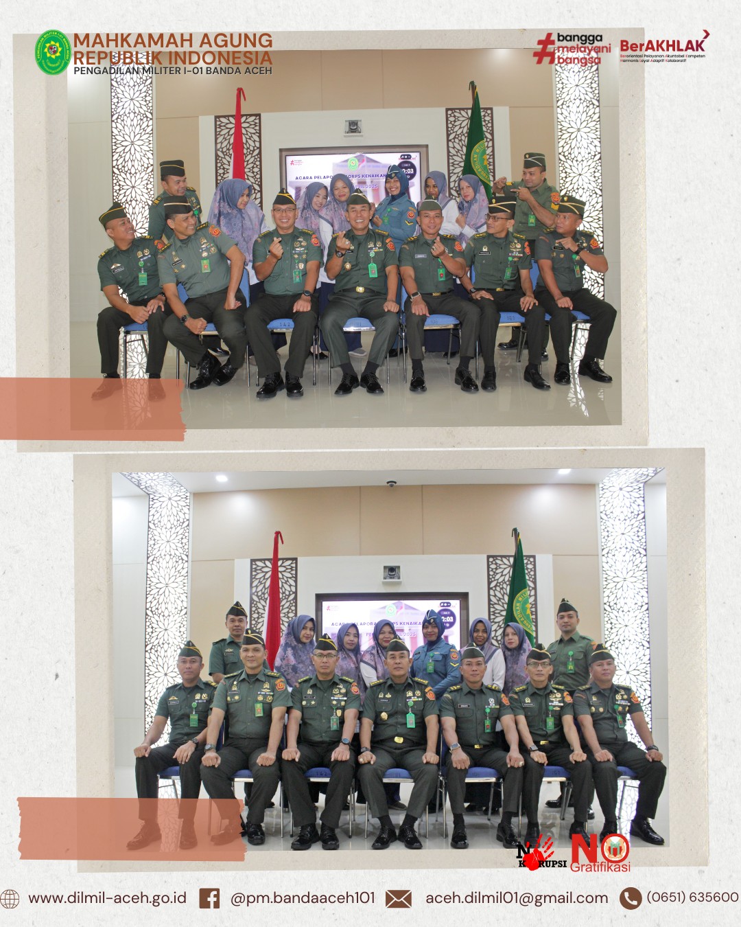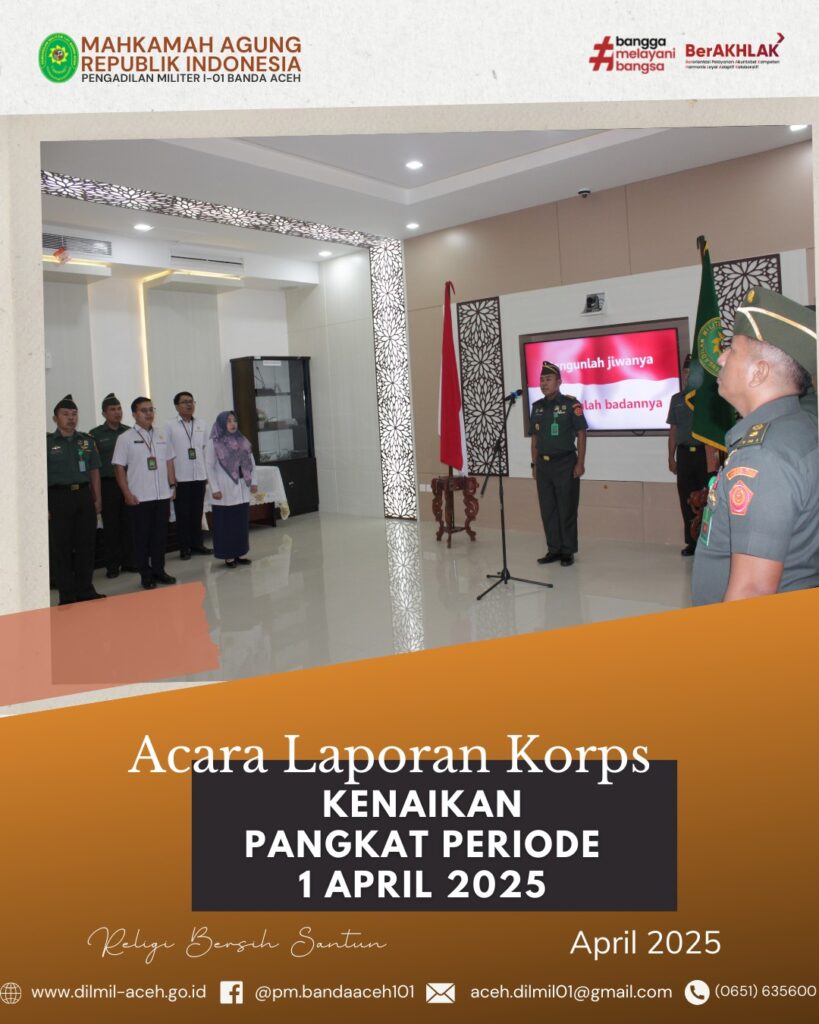 Banda Aceh – 14 April 2025. Telah dilaksanakan Acara Pelepasan Purnabakti Pegawai Pengadilan Militer I-01 Banda Aceh, bapak Zulfidar, S.Sos sekaligus Syukuran Kenaikan pangkat personel Dilmil I-01 Banda Aceh yaitu Kolonel Chk Khamdan, S.Ag., S.H., M.H., Letkol Chk Hari Santoso, S.H. dan Pelda Erwanto, S.H. serta syukuran personel baru, Serda Hum/W Devy Alya Pratama, S.H.