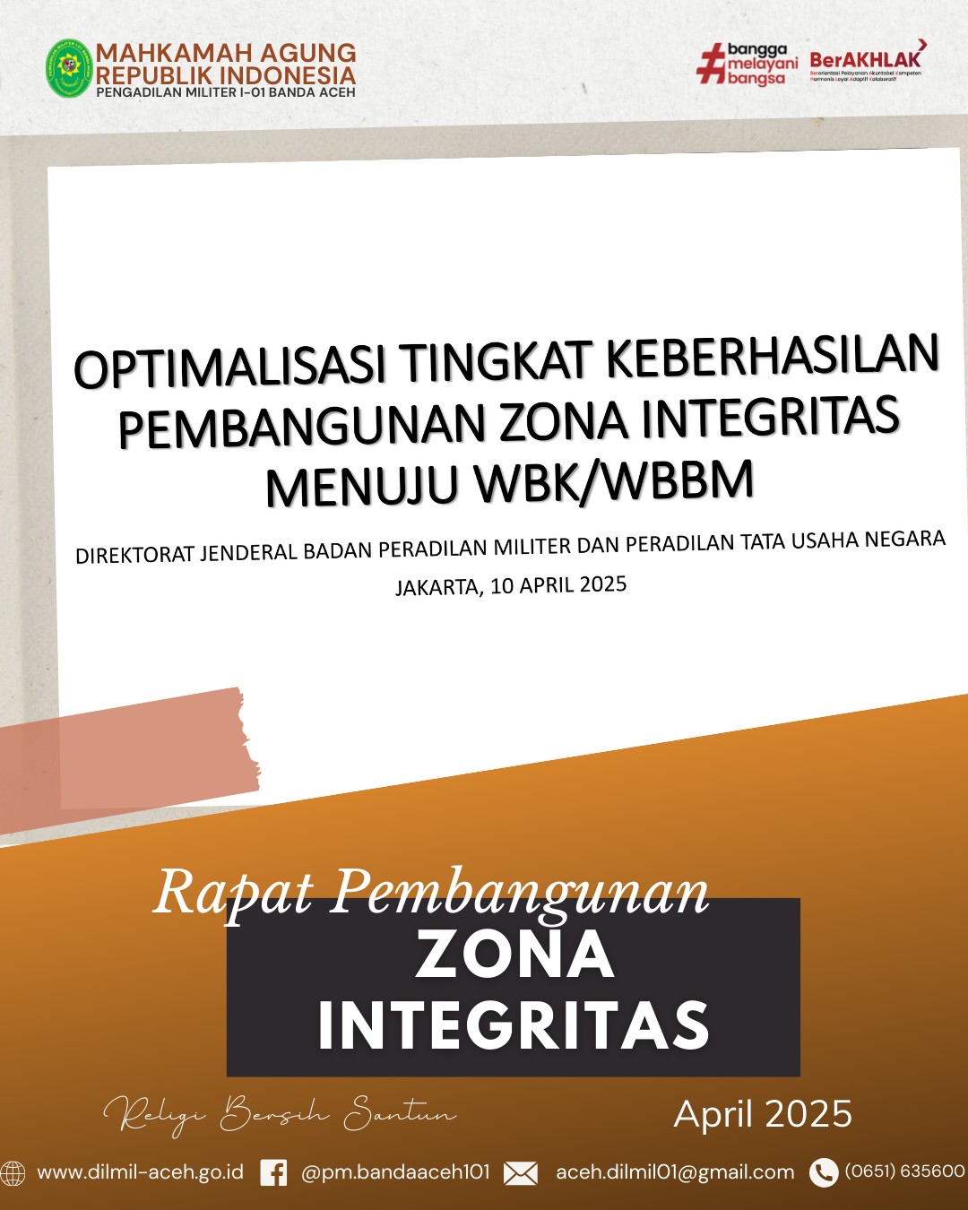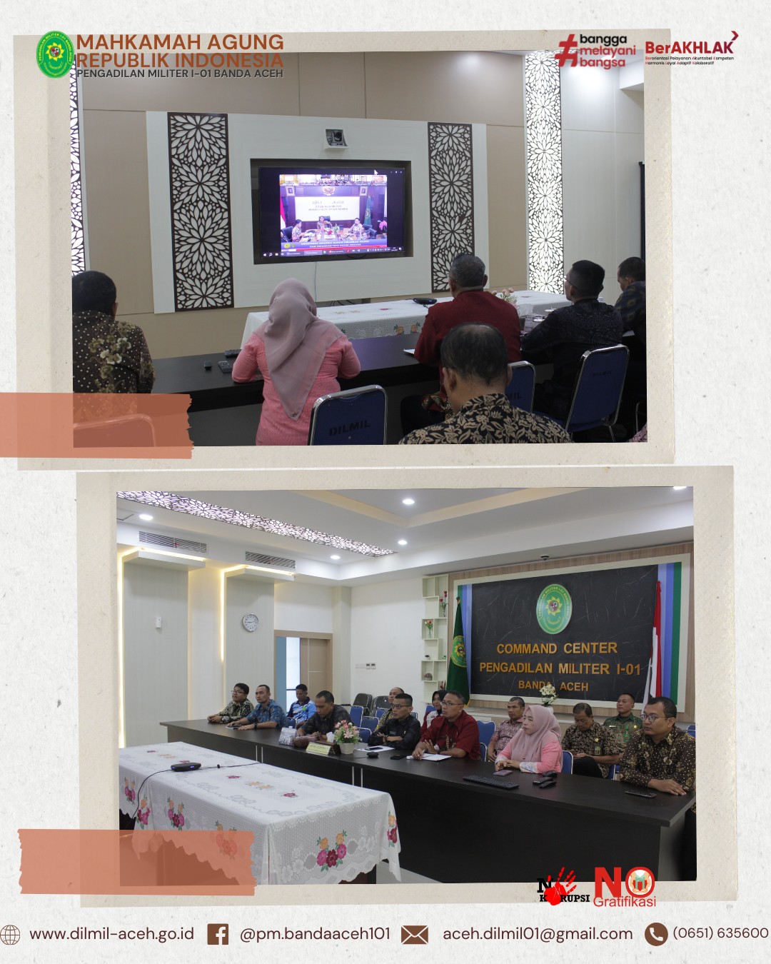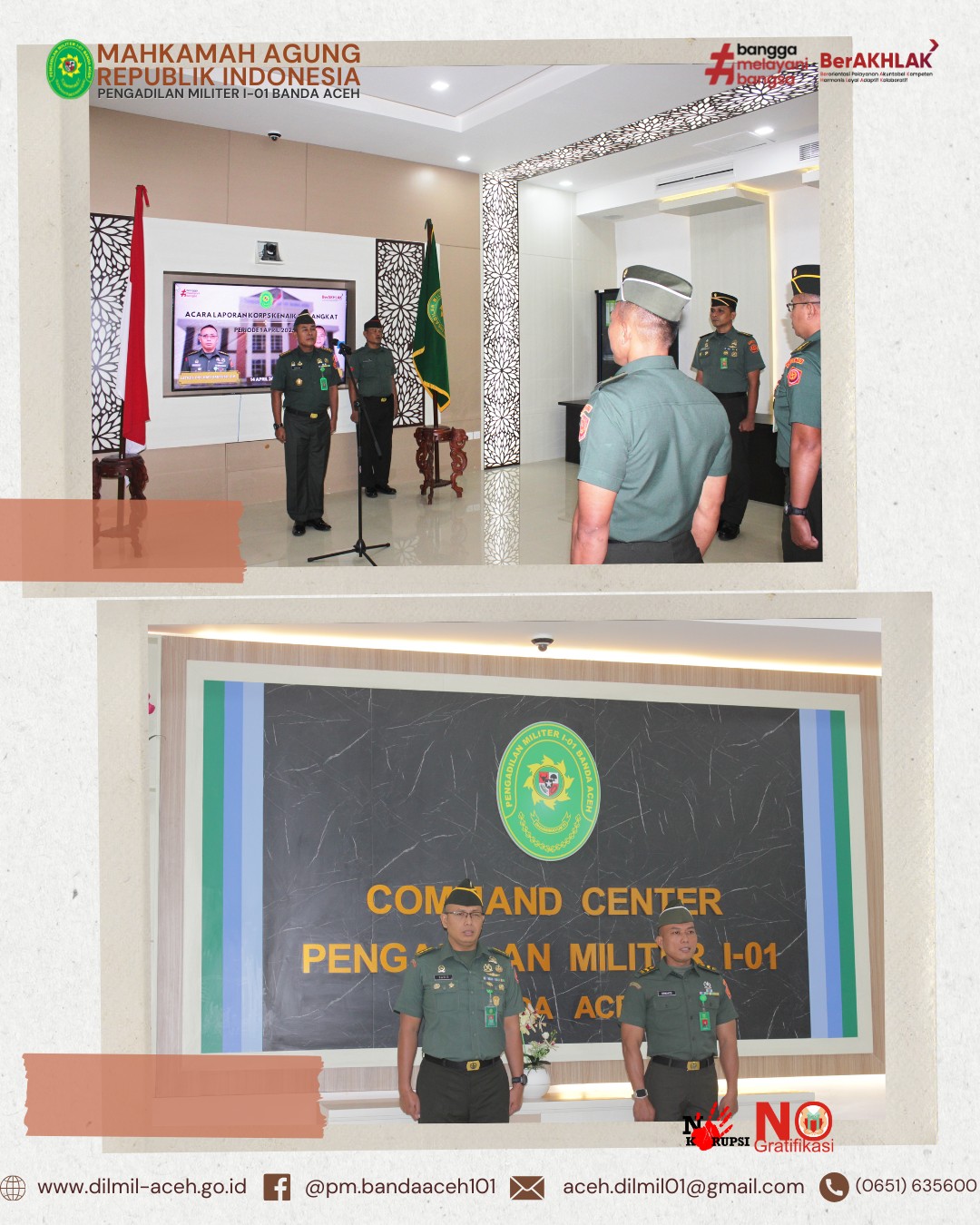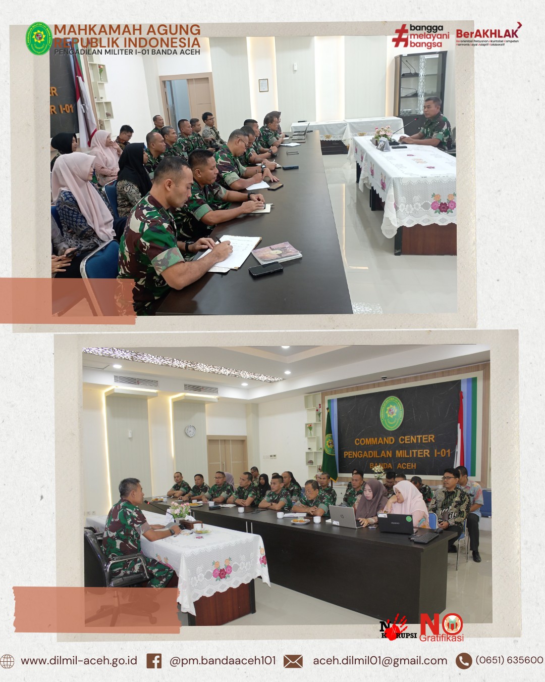 Banda Aceh – 14 April 2025. Telah dilaksanakan Acara Pelepasan Purnabakti Pegawai Pengadilan Militer I-01 Banda Aceh, bapak Zulfidar, S.Sos sekaligus Syukuran Kenaikan pangkat personel Dilmil I-01 Banda Aceh yaitu Kolonel Chk Khamdan, S.Ag., S.H., M.H., Letkol Chk Hari Santoso, S.H. dan Pelda Erwanto, S.H. serta syukuran personel baru, Serda Hum/W Devy Alya Pratama, S.H.