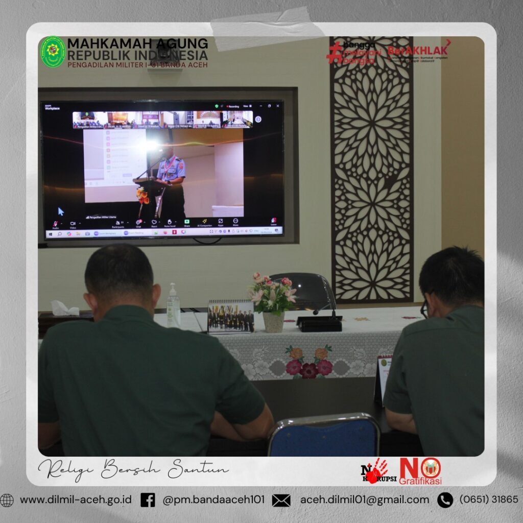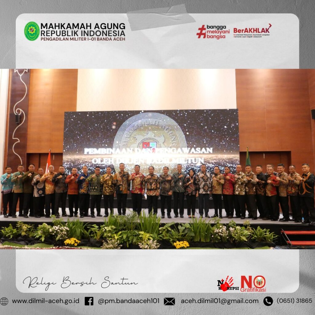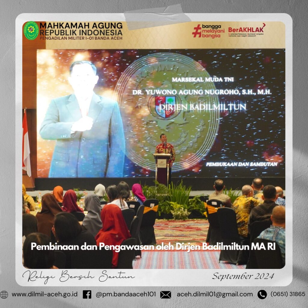 Banda Aceh – 1 Oktober 2024. Pengadilan Militer I-01 Banda Aceh melaksanakan upacara memperingati Hari Kesaktian Pancasila dengan Tema “Bersama Pancasila Kita Wujudkan Indonesia Emas”, Hakim Militer Pengadilan Militer I-01 Banda Aceh Letkol Chk Arif Kusnandar, S.H. sebagai Inspektur Upacara yang dihadiri oleh seluruh anggota Pengadilan Militer I-01 Banda Aceh.