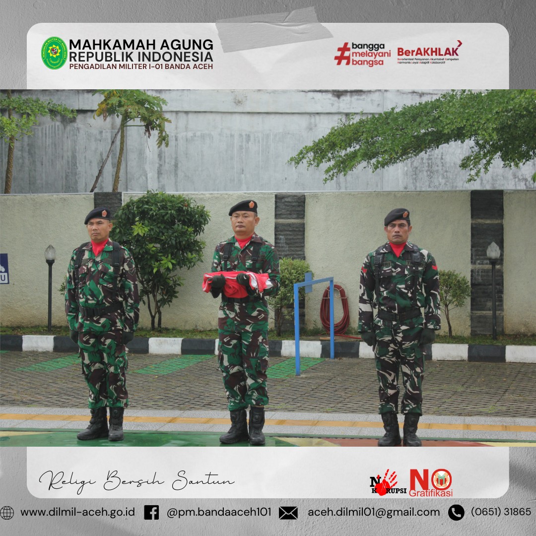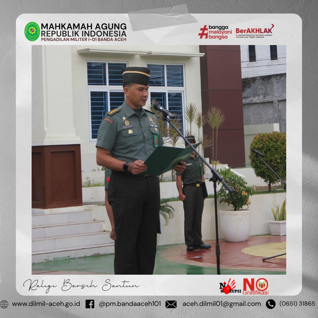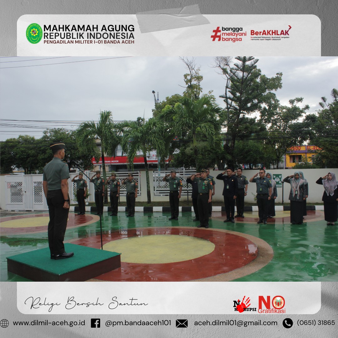 Banda Aceh – 1 Oktober 2024. Pengadilan Militer I-01 Banda Aceh melaksanakan upacara memperingati Hari Kesaktian Pancasila dengan Tema “Bersama Pancasila Kita Wujudkan Indonesia Emas”, Hakim Militer Pengadilan Militer I-01 Banda Aceh Letkol Chk Arif Kusnandar, S.H. sebagai Inspektur Upacara yang dihadiri oleh seluruh anggota Pengadilan Militer I-01 Banda Aceh.