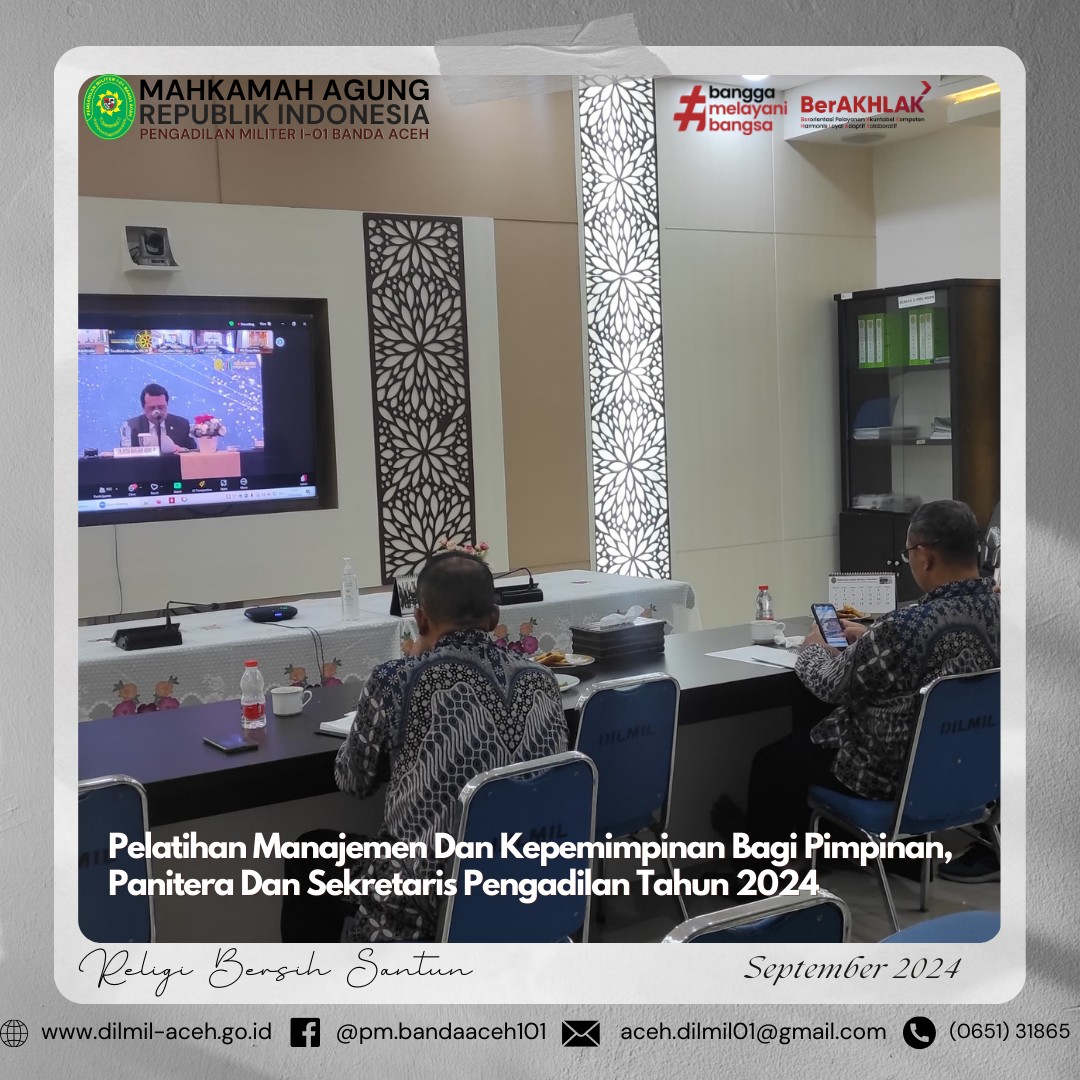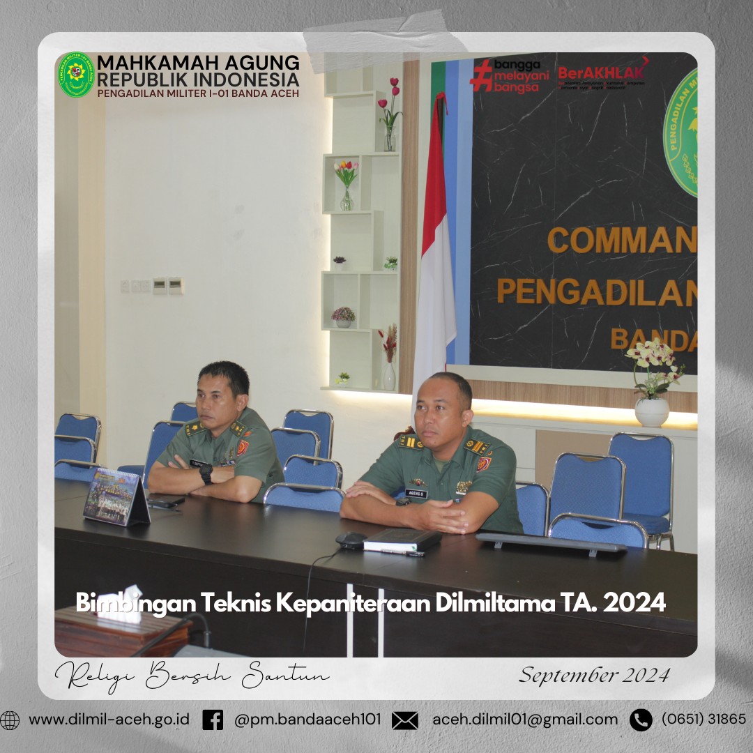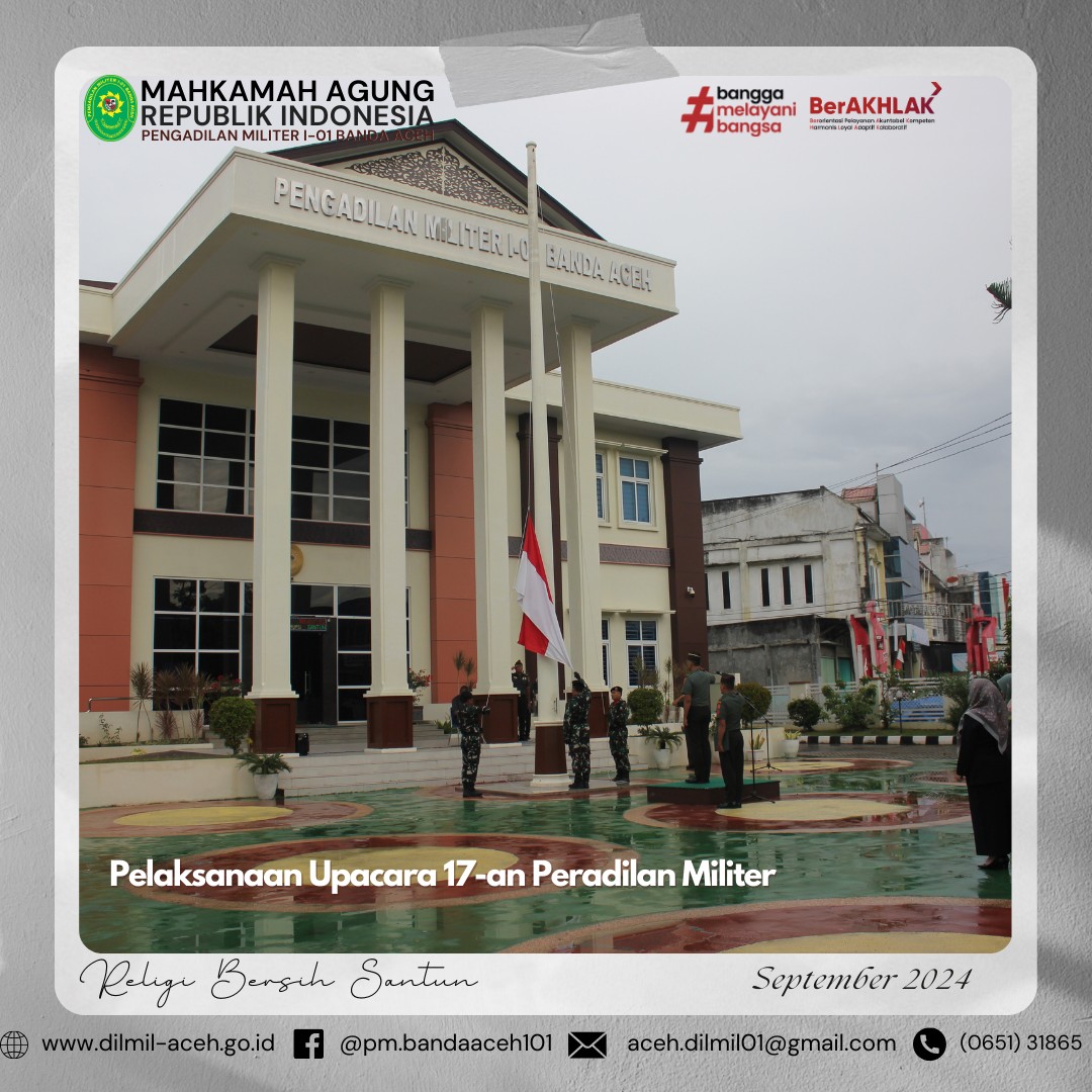 Banda Aceh – 1 Oktober 2024. Pengadilan Militer I-01 Banda Aceh melaksanakan upacara memperingati Hari Kesaktian Pancasila dengan Tema “Bersama Pancasila Kita Wujudkan Indonesia Emas”, Hakim Militer Pengadilan Militer I-01 Banda Aceh Letkol Chk Arif Kusnandar, S.H. sebagai Inspektur Upacara yang dihadiri oleh seluruh anggota Pengadilan Militer I-01 Banda Aceh.