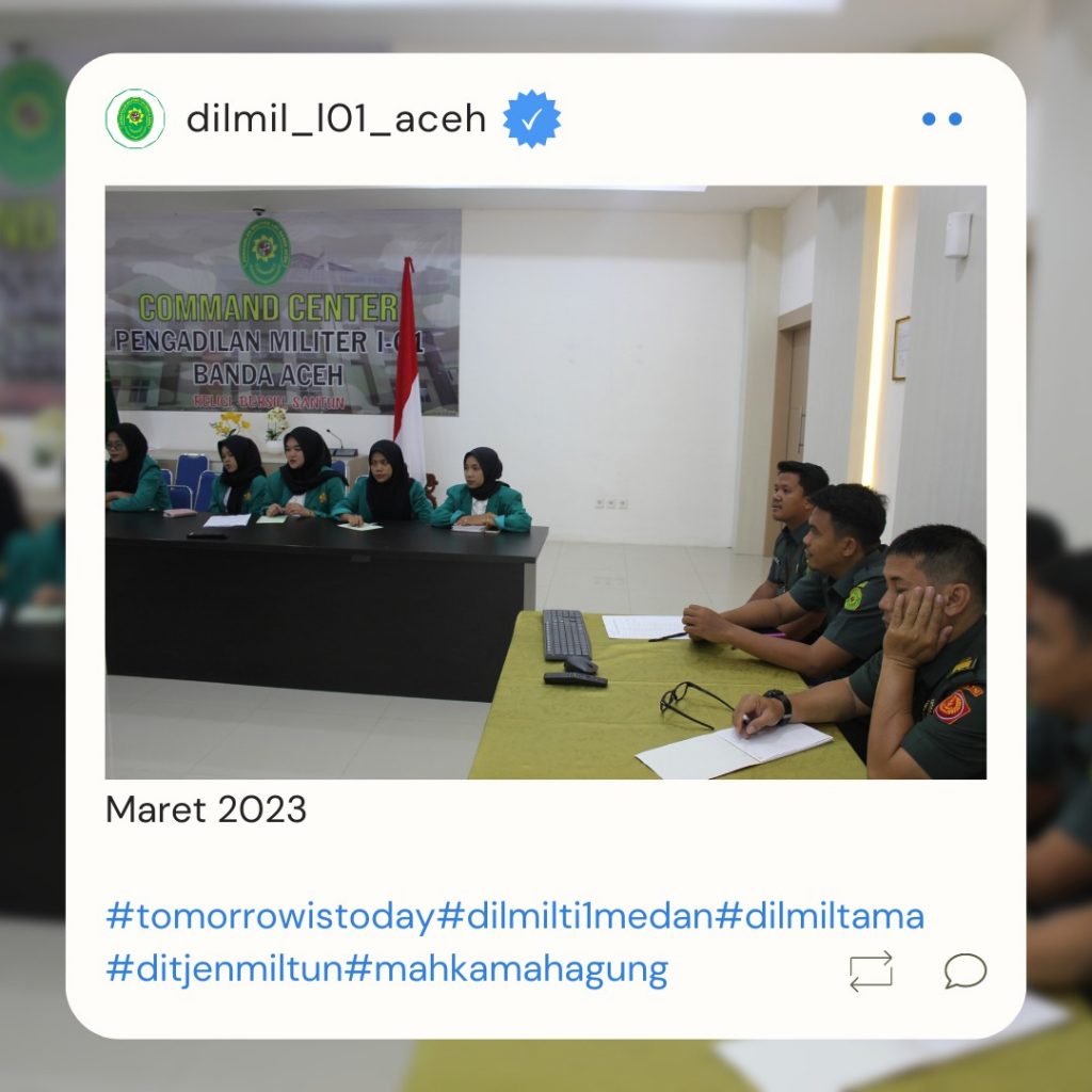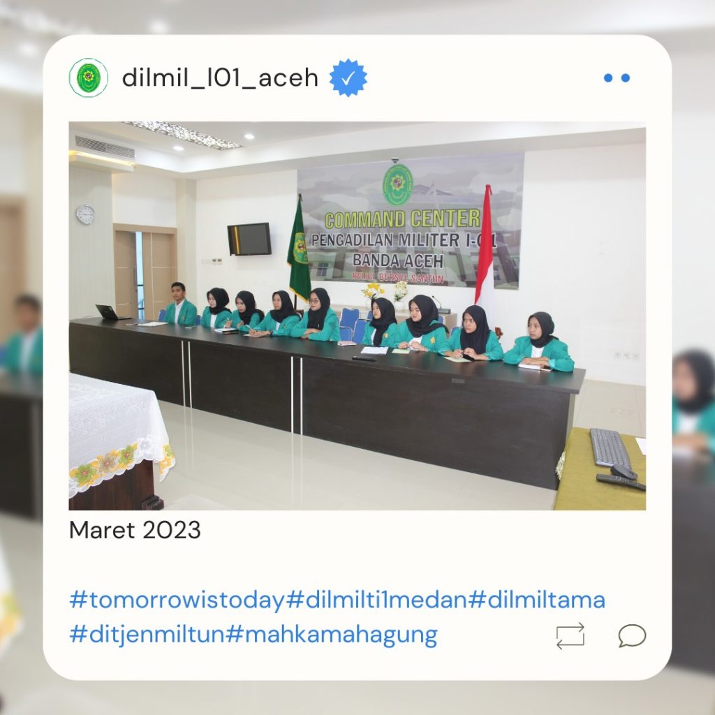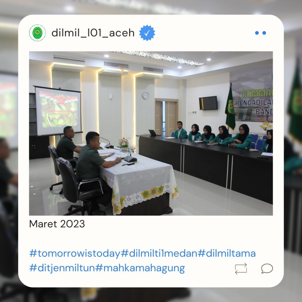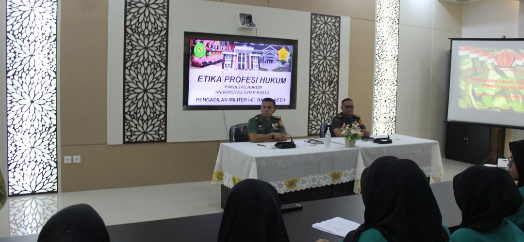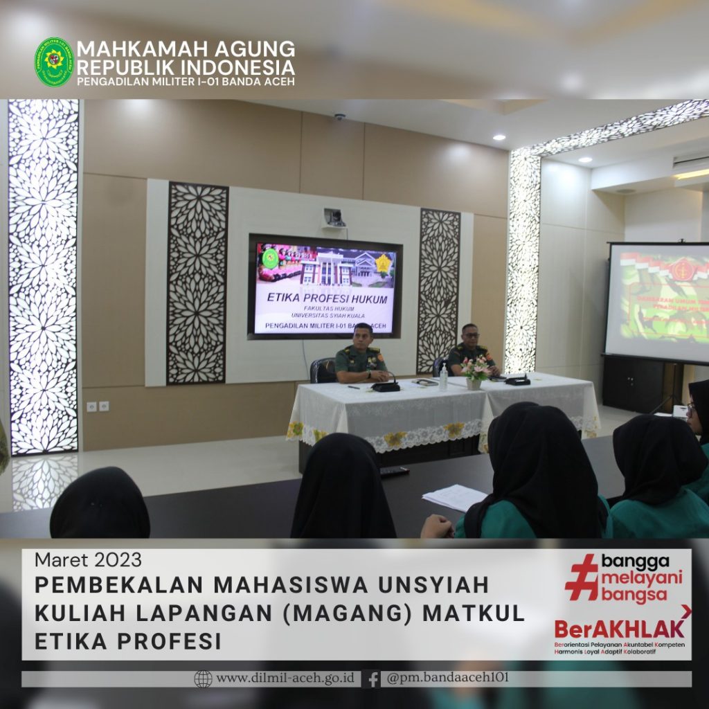 Banda Aceh – 29 Maret 2023. Kadilmil I-01 Banda Aceh Kolonel Chk Masykur, S.T., S.H., M.H. didampingi oleh Hakim Militer Letkol Setijatno, S.H. dan Panitera Kapten Chk Teddy Septiana, S.H., memberikan pembekalan kepada mahasiswa Prodi Ilmu Hukum Unsyiah yang melaksanakan program kuliah lapangan mata kuliah Etika Profesi (magang) di Pengadilan Militer I-01 Banda Aceh. Mata kuliah etika profesi adalah mata kuliah yang wajib diambil oleh setiap mahasiswa program studi ilmu hukum. Mata kuliah ini mempelajari tentang profesi-profesi hukum yang ada di Indonesia terkait dengan kode etik profesi, tugas dan fungsi dari masing-masing profesi.