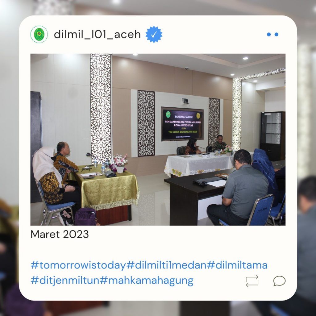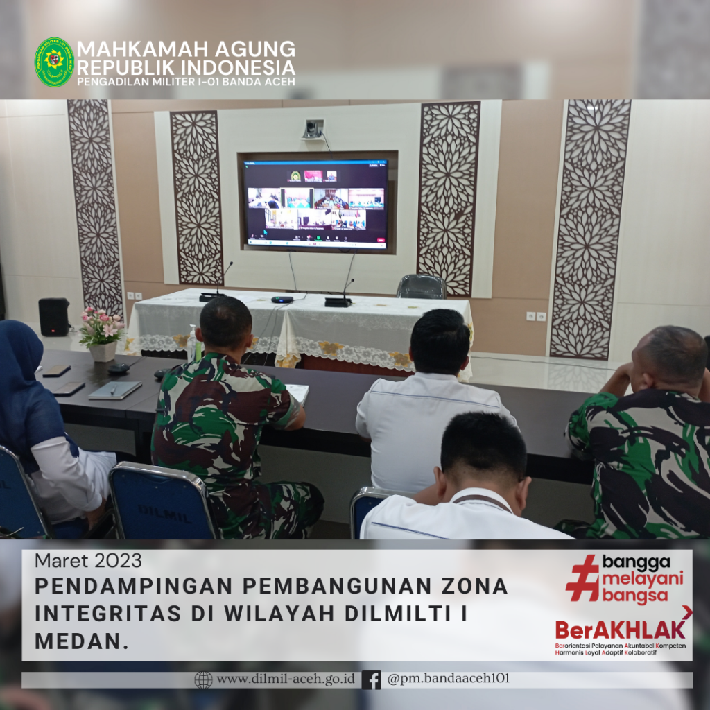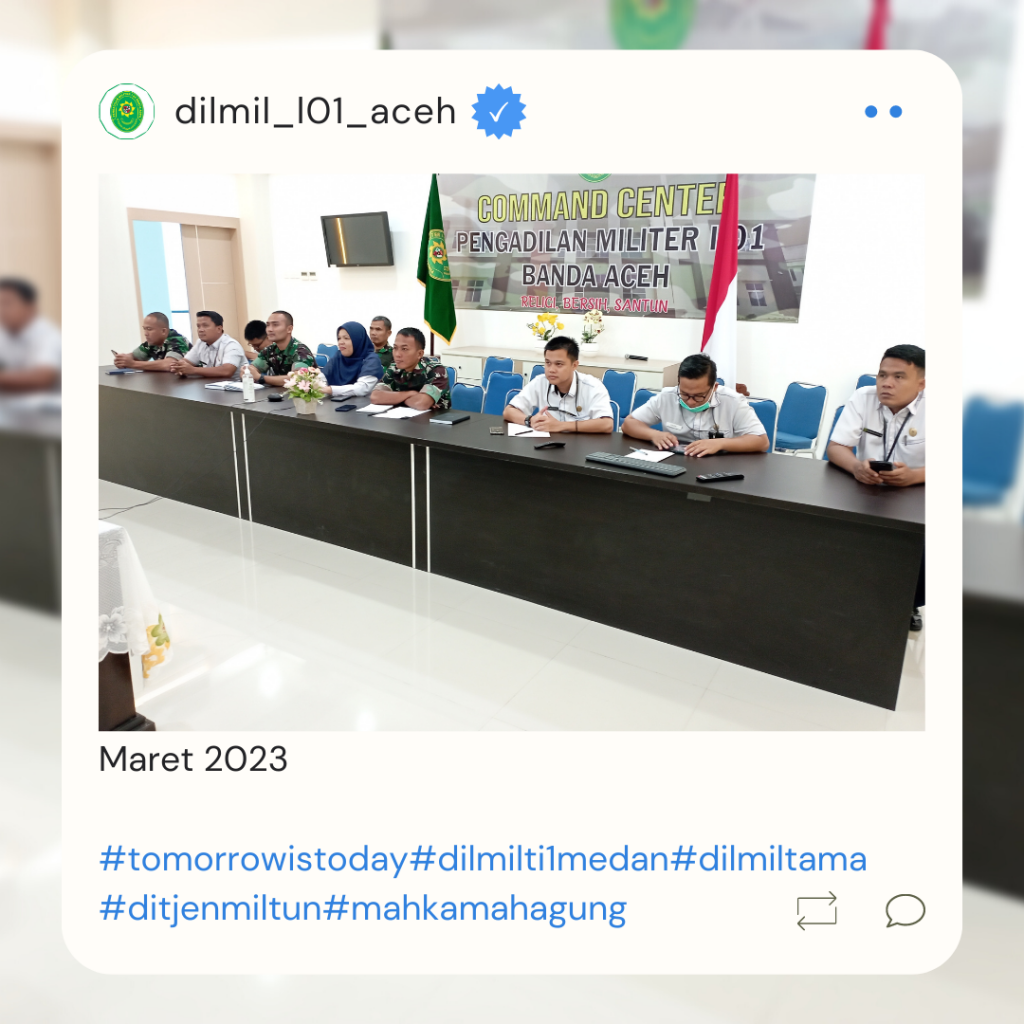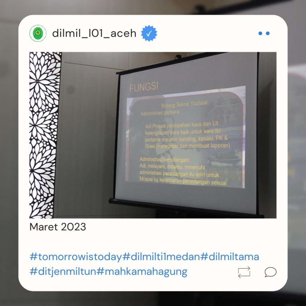 Banda Aceh – 29 Maret 2023. Kadilmil I-01 Banda Aceh Kolonel Chk Masykur, S.T., S.H., M.H. didampingi oleh Hakim Militer Letkol Setijatno, S.H. dan Panitera Kapten Chk Teddy Septiana, S.H., memberikan pembekalan kepada mahasiswa Prodi Ilmu Hukum Unsyiah yang melaksanakan program kuliah lapangan mata kuliah Etika Profesi (magang) di Pengadilan Militer I-01 Banda Aceh. Mata kuliah etika profesi adalah mata kuliah yang wajib diambil oleh setiap mahasiswa program studi ilmu hukum. Mata kuliah ini mempelajari tentang profesi-profesi hukum yang ada di Indonesia terkait dengan kode etik profesi, tugas dan fungsi dari masing-masing profesi.