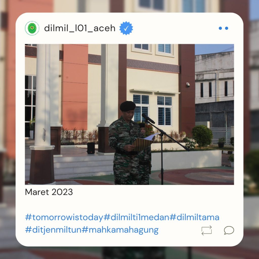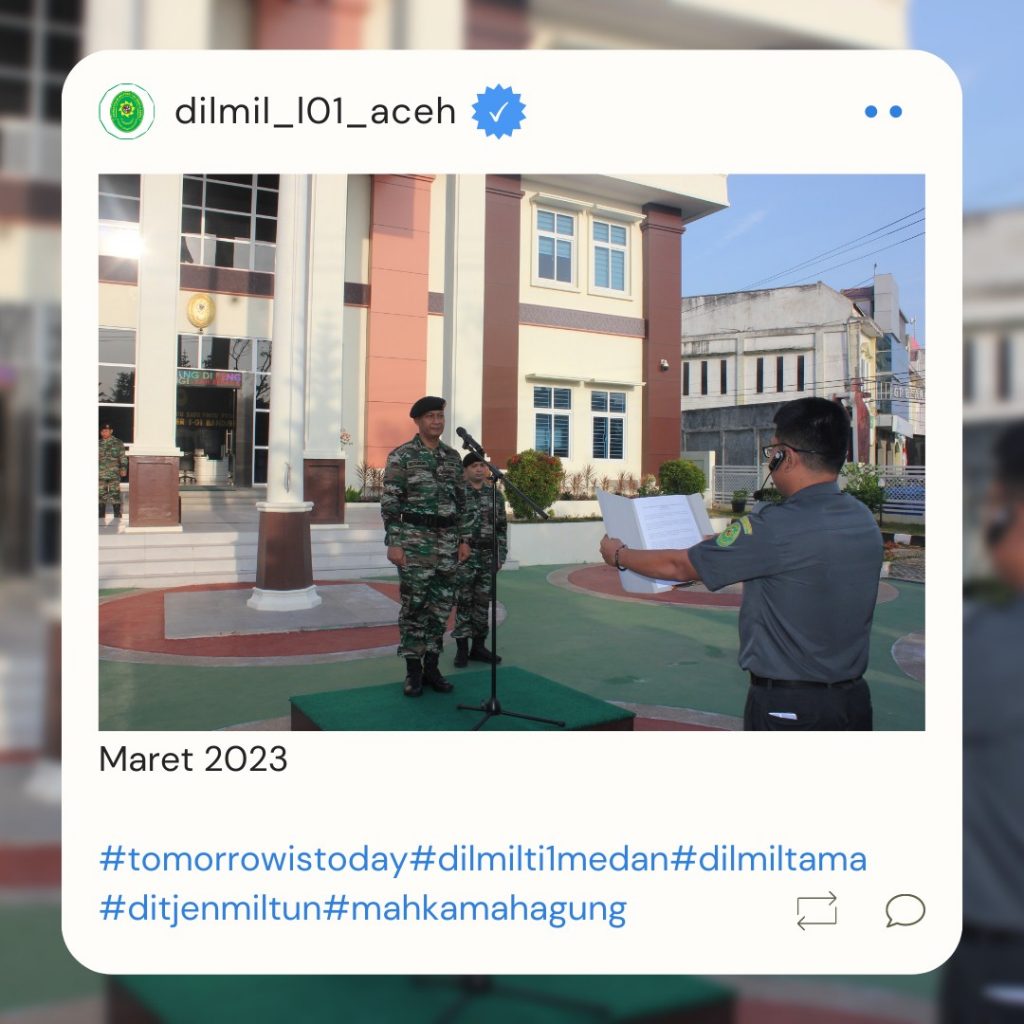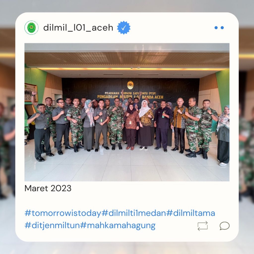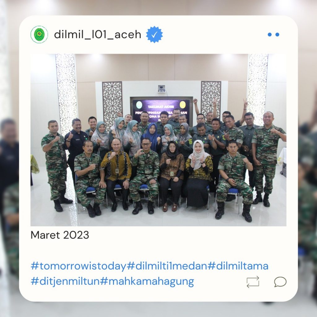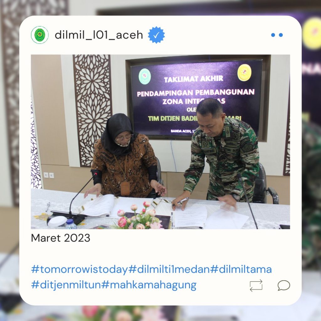 Banda Aceh – 29 Maret 2023. Kadilmil I-01 Banda Aceh Kolonel Chk Masykur, S.T., S.H., M.H. didampingi oleh Hakim Militer Letkol Setijatno, S.H. dan Panitera Kapten Chk Teddy Septiana, S.H., memberikan pembekalan kepada mahasiswa Prodi Ilmu Hukum Unsyiah yang melaksanakan program kuliah lapangan mata kuliah Etika Profesi (magang) di Pengadilan Militer I-01 Banda Aceh. Mata kuliah etika profesi adalah mata kuliah yang wajib diambil oleh setiap mahasiswa program studi ilmu hukum. Mata kuliah ini mempelajari tentang profesi-profesi hukum yang ada di Indonesia terkait dengan kode etik profesi, tugas dan fungsi dari masing-masing profesi.