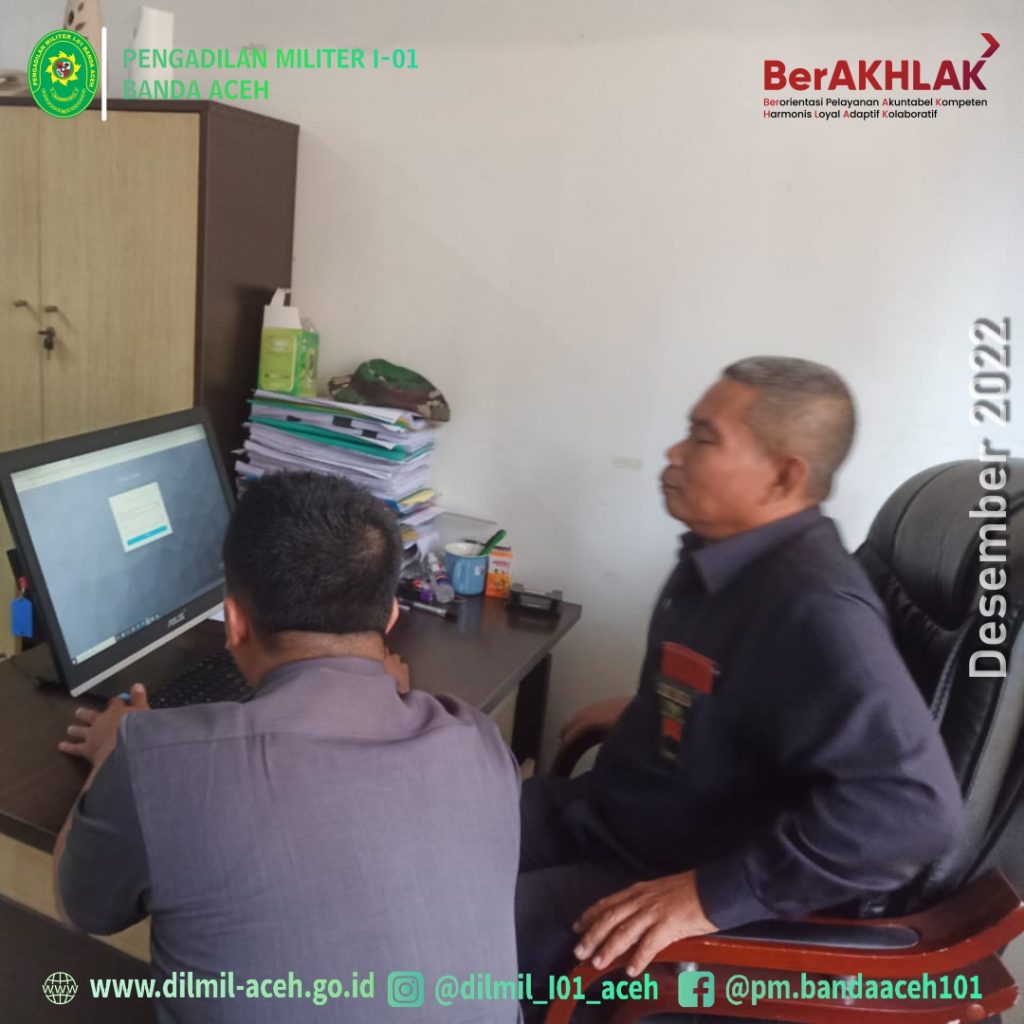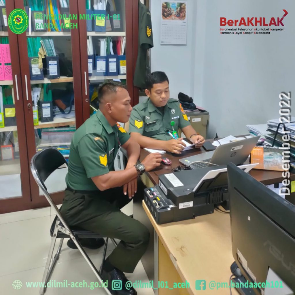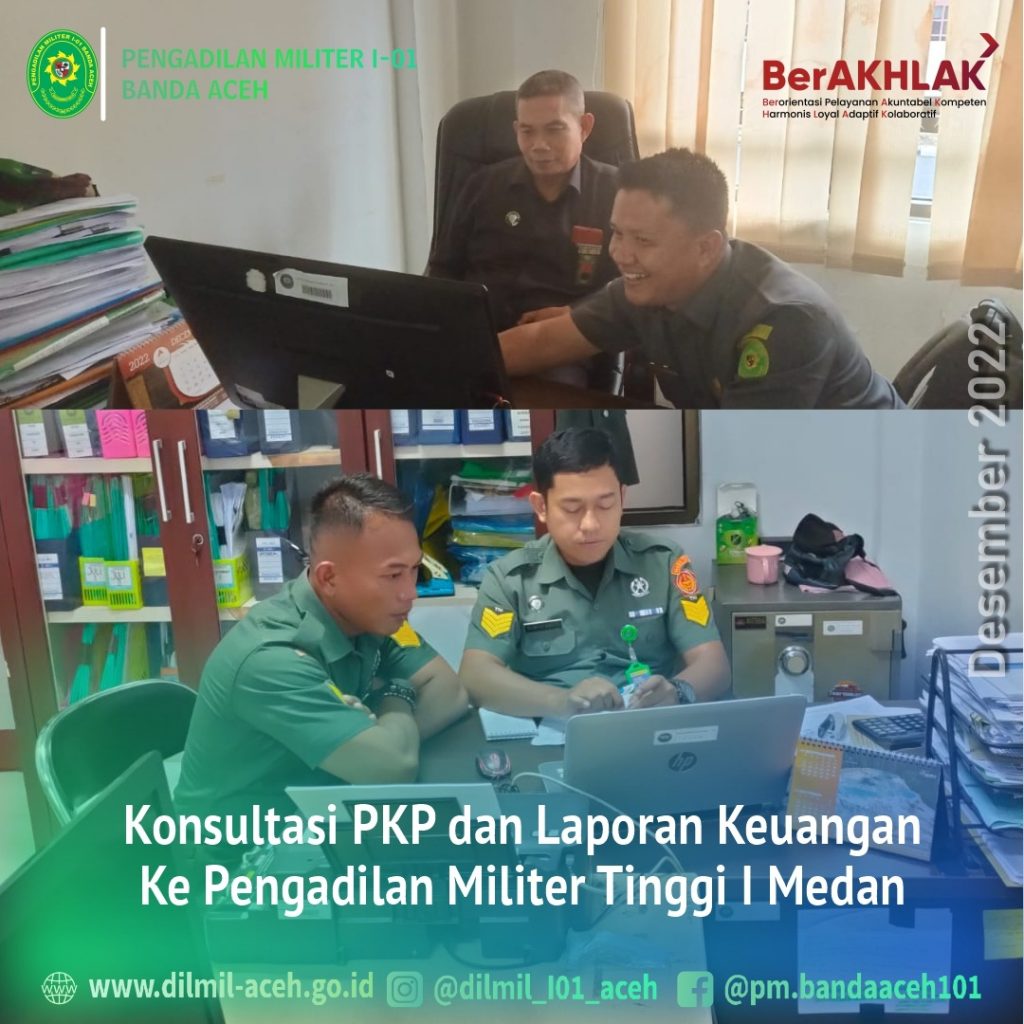 Medan – 22 Desember 2022. Bendahara Dilmil I-01 Banda Aceh Serma Erwanto, S.H. dan Analis Kepegawaian Dilmil I-01 Banda Aceh, Sangkot Puli, S.H. melaksanakan kegiatan dinas luar dalam rangka Konsultasi PKP dan Laporan Keuangan ke Pengadilan Militer Tinggi I Medan selama 3 (tiga) hari mulai tanggal 21 Desember s.d. 23 Desember 2022.