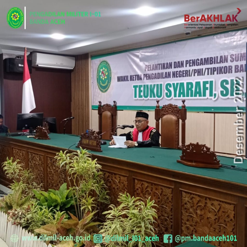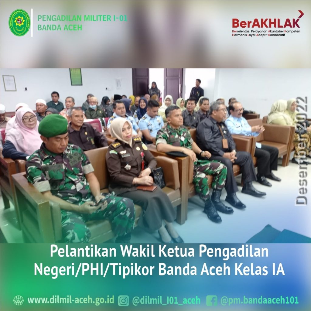 Banda Aceh – 27 Desember 2022. Kepala Pengadilan Militer I-01 Banda Aceh, Kolonel Chk Masykur, S.T., S.H., M.H. menghadiri pelantikan Wakil Ketua Pengadilan Negeri/PHI/Tipikor Banda Aceh Kelas IA, Teuku Syarafi, S.H. ,M.H. , di gedung Pengadilan Tipikor Banda Aceh.