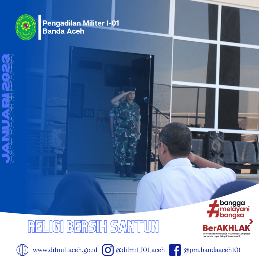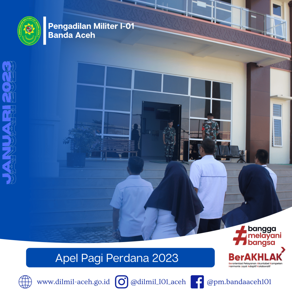Banda Aceh – 2 Januari 2023. Pelaksanaan Apel pagi perdana di Tahun 2023 oleh Kadilmil I-01 Banda Aceh, Kolonel Chk Masykur, S.T., S.H., M.H. dihadiri oleh seluruh personil.