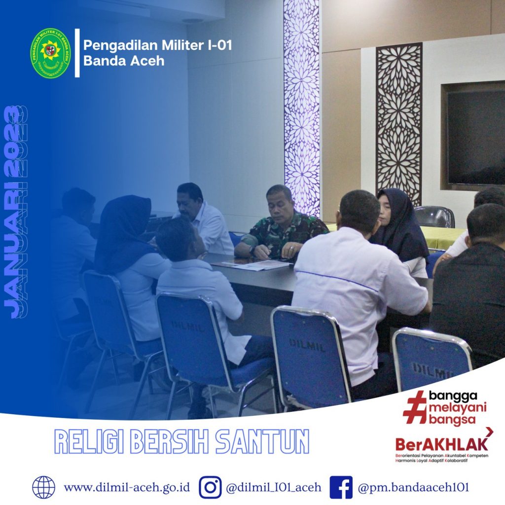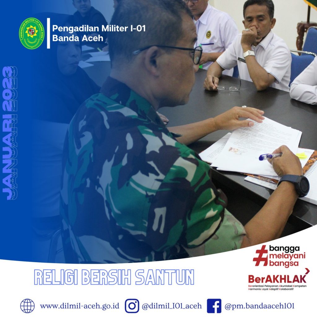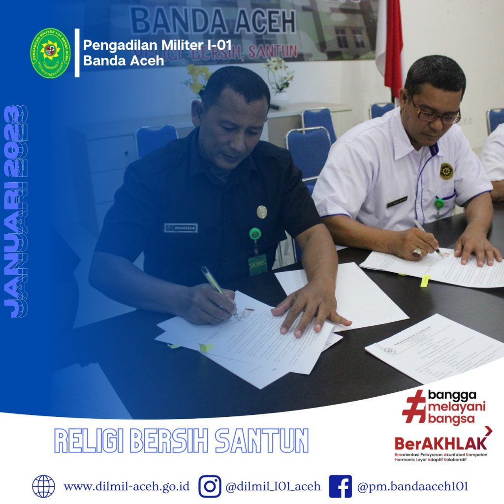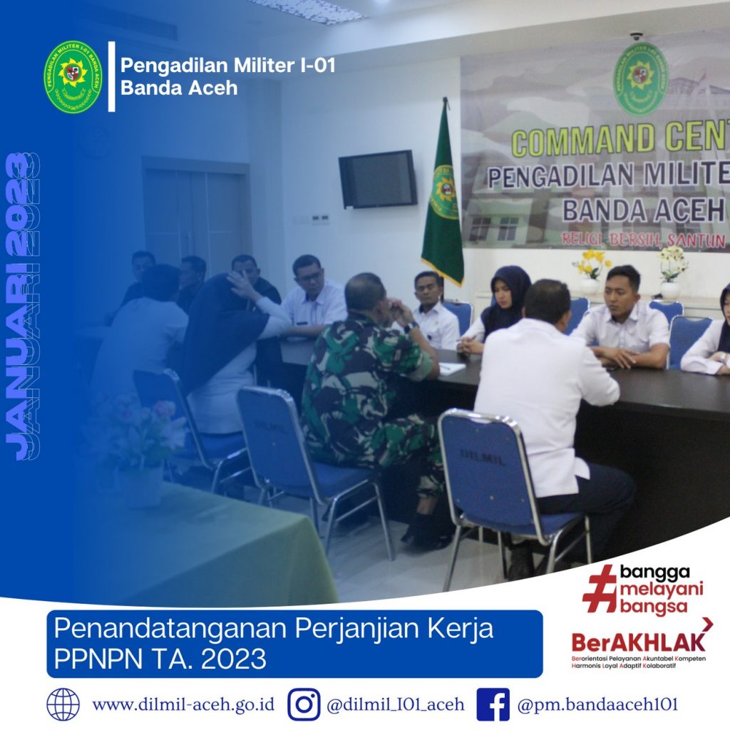 Banda Aceh – 2 Januari 2022. Bertempat di Ruang Auditorium Pengadilan Militer I-01 Banda Aceh telah diadakan kegiatan Penandatanganan Perjanjian Kerja bagi Pegawai Pemerintah Non Pegawai Negeri (PPNPN) T.A 2023. Proses Penandatanganan perjanjian kerja tersebut di saksikan oleh Sekretaris Pengadilan Militer I-01 Banda Aceh Mayor Chk Sukarto, S.H. didampingi Kasubbag Umum dan Keuangan Zulfidar, S.Sos, Plt. Kasubbag Kepegawaian dan Ortala Supriadi Koto, S.E. dan Kasubbag PTIP Iin Subandia, S.E.